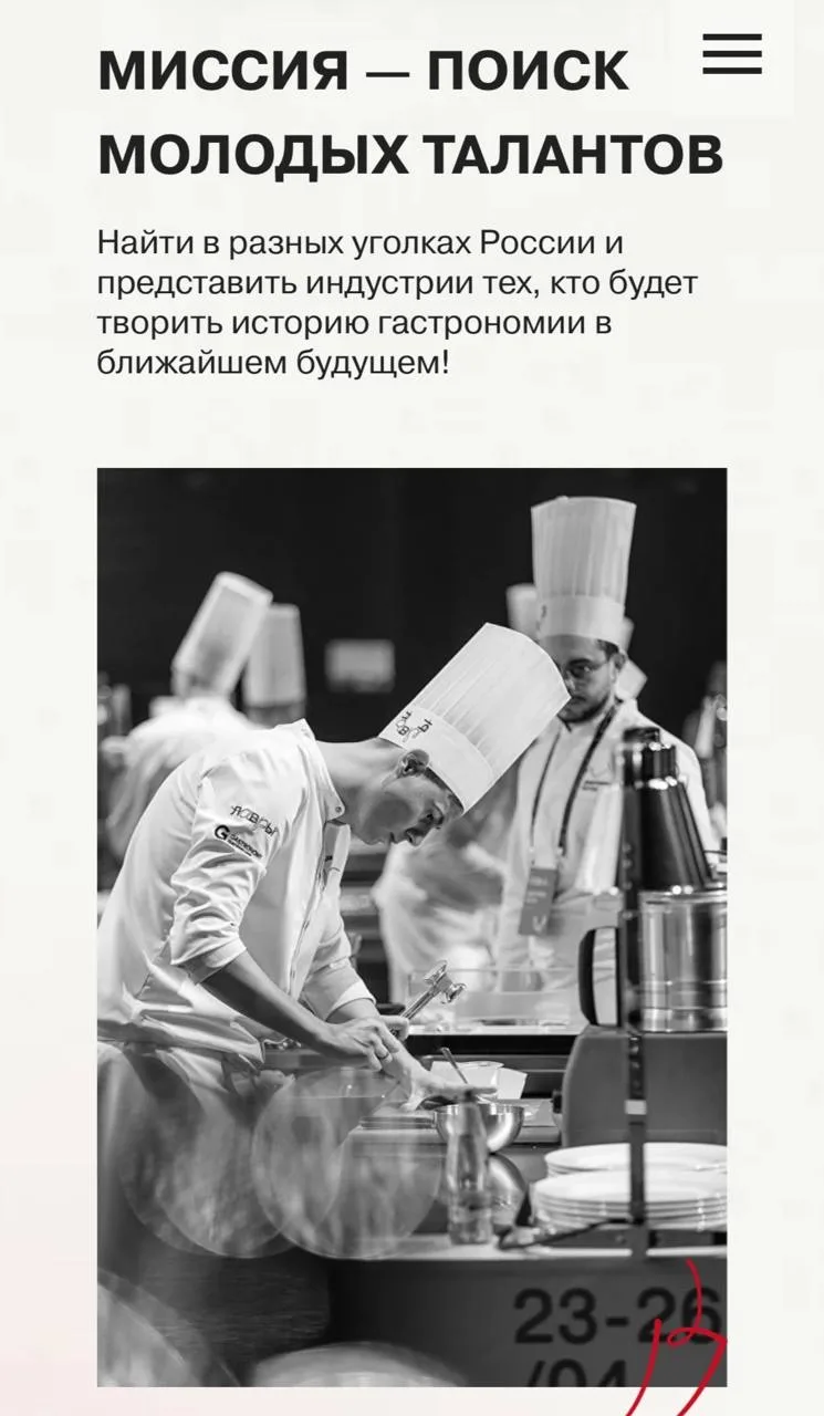 Конкурс — это многоэтапная программа роста для специалистов общепита. Участникам нужно записать видеовизитку. Победитель получит звание лучшего молодого шефа России и стажировку за рубежом. В прошлом сезоне победитель проходил обучение в ресторане Gaggan at Louis Vuitton в Бангкоке.