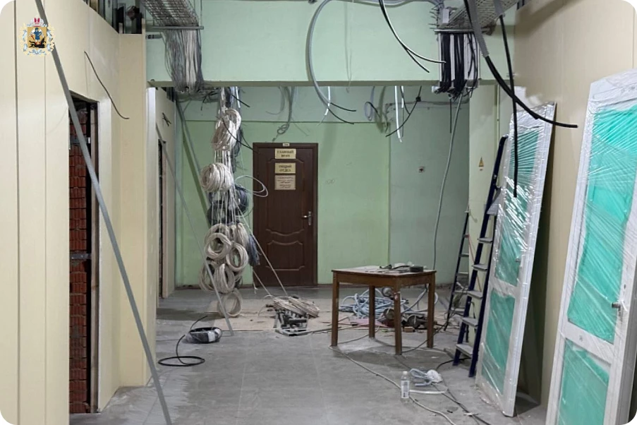 Сейчас в больнице идет масштабный капремонт: в здании взрослой поликлиники выполнен монтаж электрических сетей, окон, дверей и напольного покрытия. Завершается кабельный цикл, идет установка дверей в кабинетах и облицовка стен гипсокартоном.