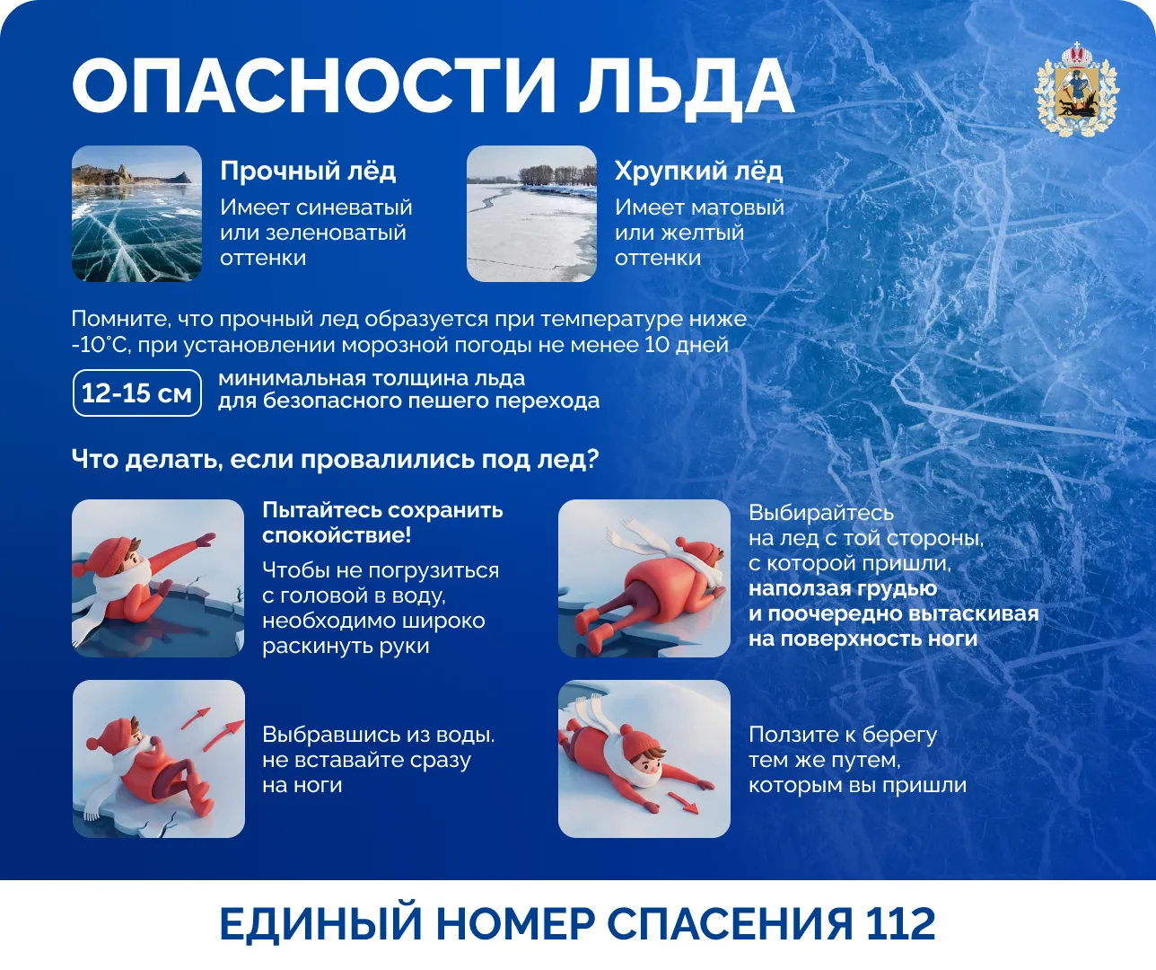 Главное правило — не выходить на лёд до его полного становления! Если же вы попали в беду, алгоритм действий — в нашей карточке.