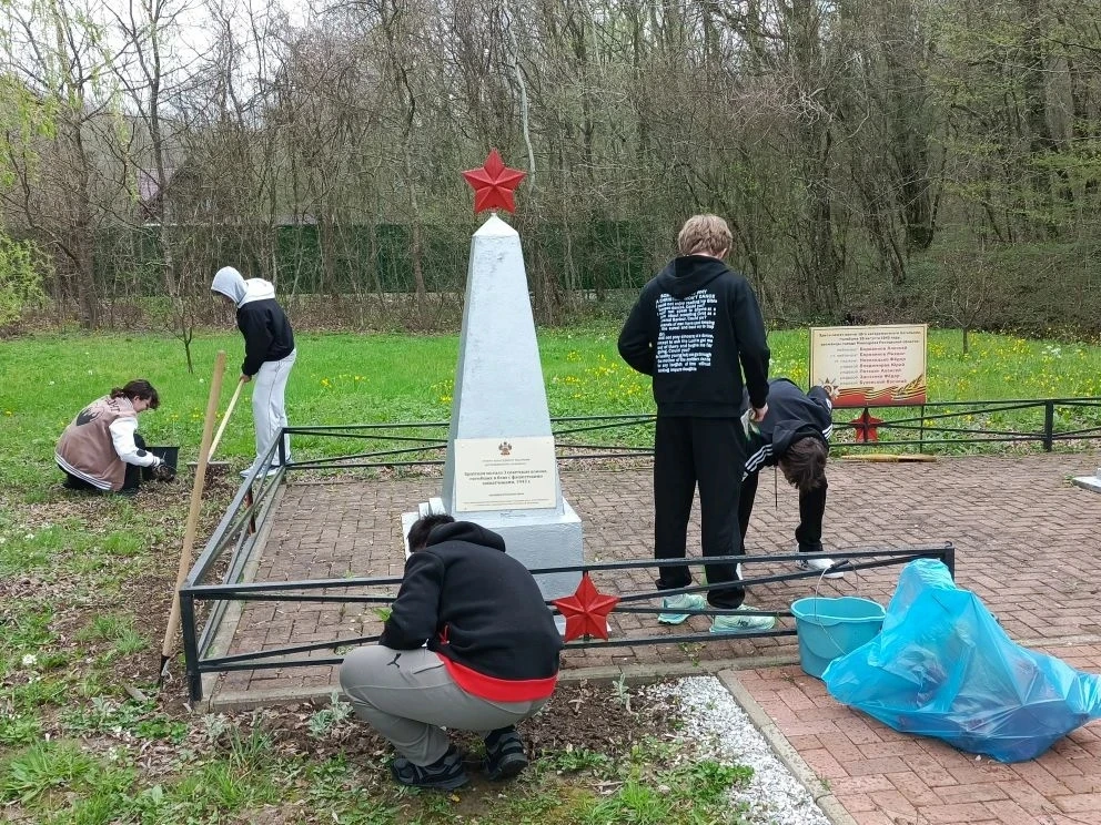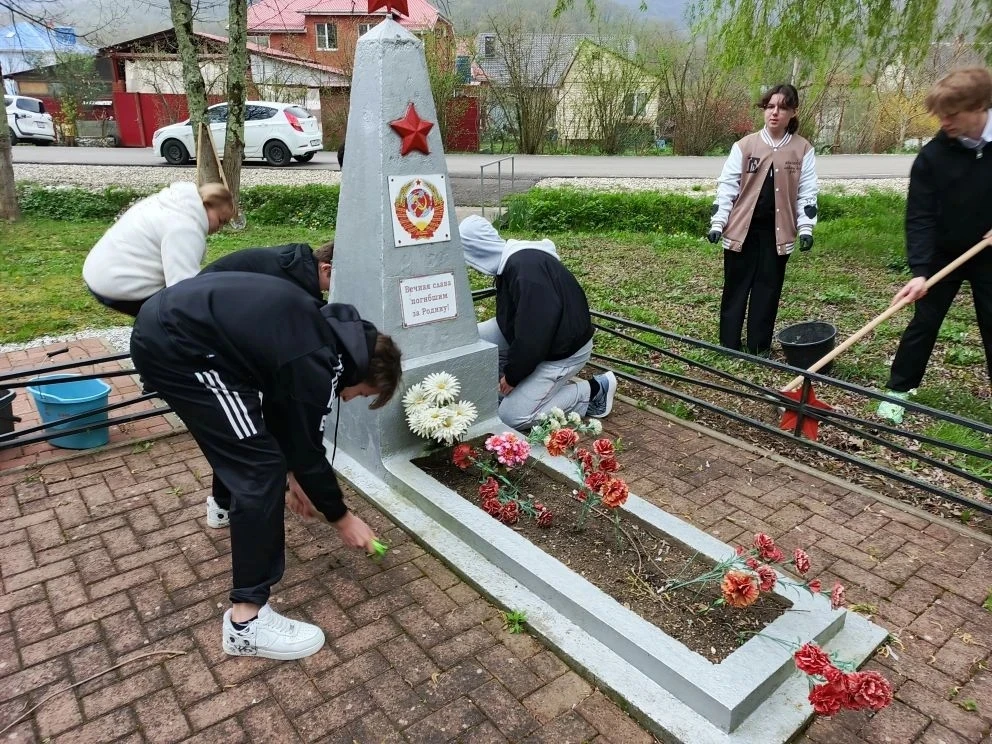 💫 Активисты Движения Первых учащиеся 9 класса ООШ №24 с.Текос вместе с советником директора по воспитанию Ромаш Я. А. очистили территорию братских могил от сухой листвы и веток, вскопали и посадили цветы, вырвали траву и очистили плитку, а также собрали мусор.
