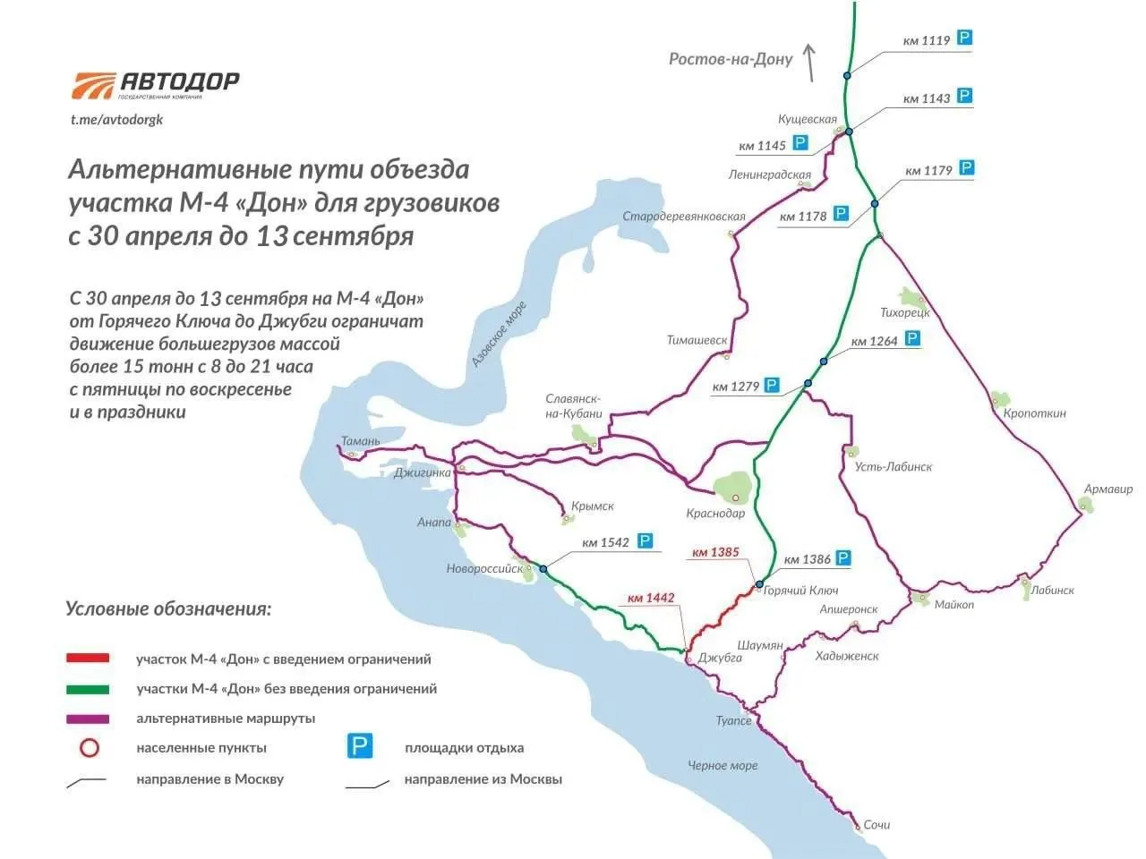 С 30 апреля по 13 сентября 2026 г. на трассе М-4 «Дон» вводится ограничение проезда грузовиков с разрешенной максимальной массой более 15 тонн. Оно будет действовать на участке с 1385 по 1442 км (от Горячего Ключа до Джубги) с пятницы по воскресенье и в праздничные дни с 08:00 до 21:00. В будни и ночное время проезд открыт для всех.