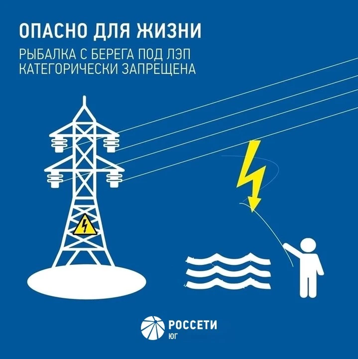 🎣Энергетики #РоссетиЮг – #Кубаньэнерго напоминают, что ловля рыбы рядом с линиями электропередачи может привести к трагическим последствиям, и призывают рыбаков соблюдать простые правила электробезопасности: