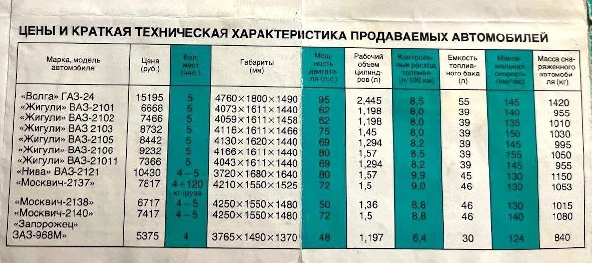 Вот табличка с государственными ценами из буклета 1981 года: самой дешёвой моделью был Запорожец ЗАЗ-968М за 5375 рублей, самой дорогой — Волга ГАЗ-24 за 15195 рублей.