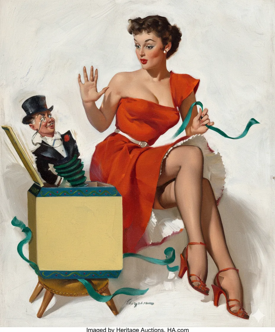 Художник принципиально не изображал роковых красавиц и женщин-вамп, как это любили делать другие авторы. Например, его коллега по цеху Альберто Варгас. Он рисовал «девушек-соседок», попавших в пикантные и забавные ситуации: ветер поднял юбку, собачка потянула за подол, пуговица предательски расстегнулась, растаявшее мороженое капнуло на грудь… И всё это — с распахнутыми глазами, вытянутыми уточкой губами и выражением лица, в котором словно читается: «Ой, как неловко… но ведь вы не против, правда?»