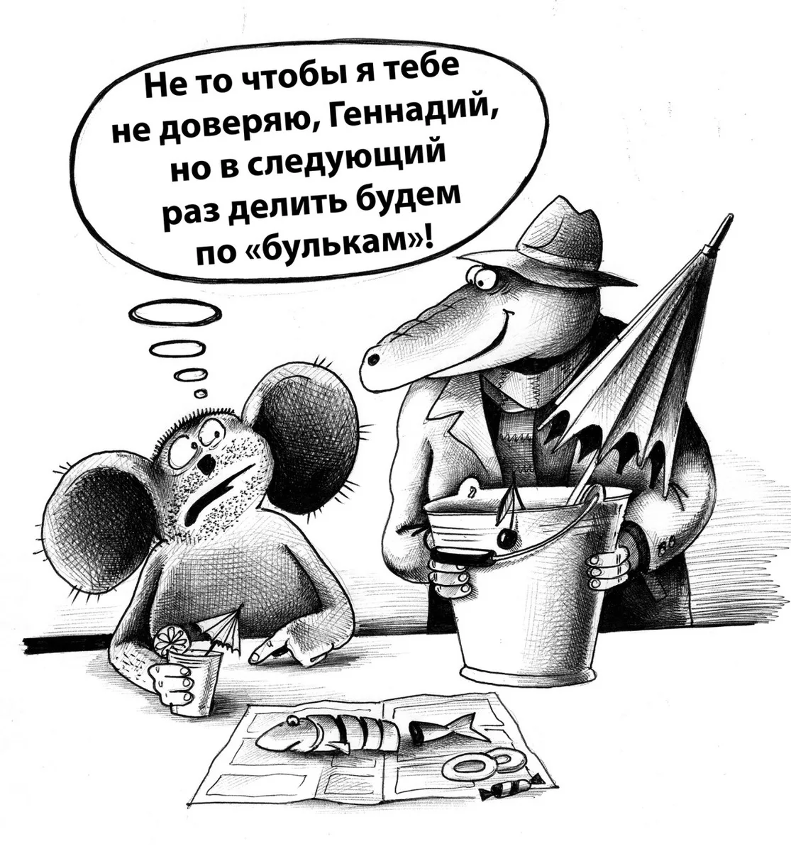 Но при этом в каждую карикатуру он стремится уместить максимум смысла. Юмор и сатира, переданные с помощью рисунка, должны моментально взаимодействовать с аудиторией. Это универсальный язык, понятный в любой стране и на любом континенте. Фань судит очень строго: если в текст приходится добавлять слова, это означает, что картинка не работает, и автор не справился, схалтурил, не дотянул выбранный сюжет до конца.