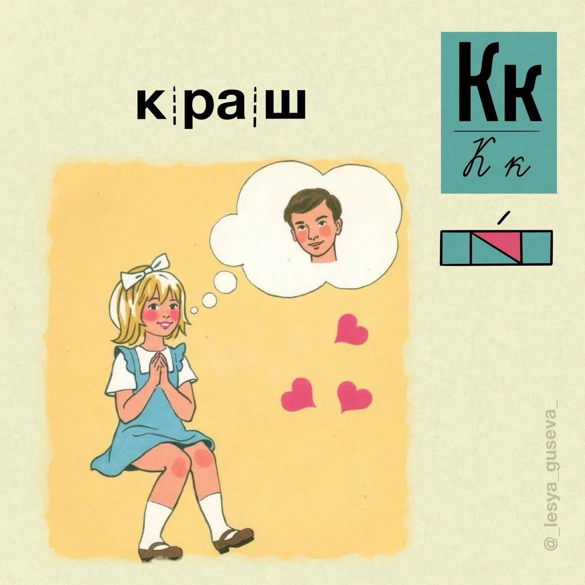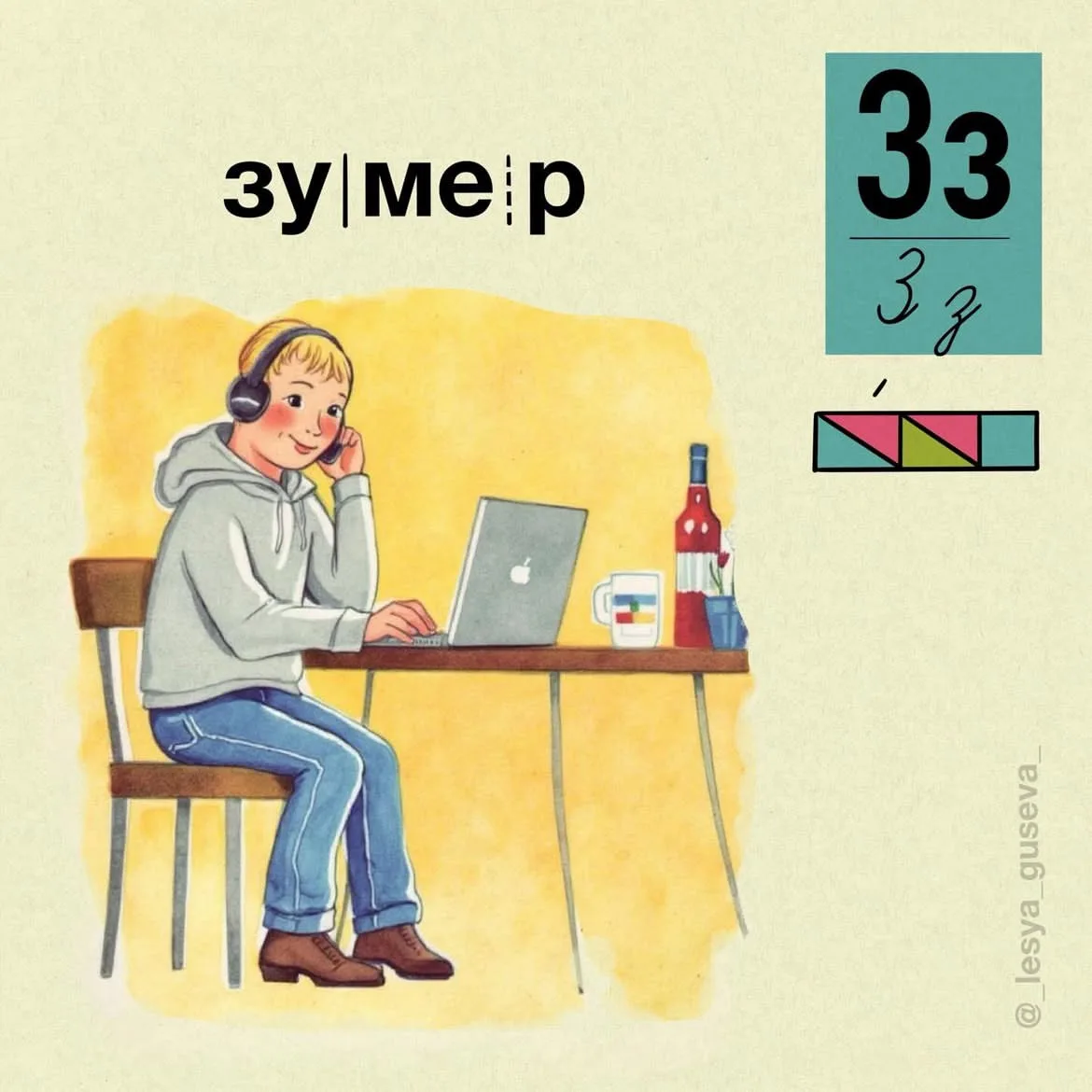 Современные юноши и девушки общаются на своём языке, который очень сложно понять их родителям, не говоря уже о людях более старшего возраста. Художник и дизайнер Леся Гусева проиллюстрировала молодёжный лексикон, причём сделала это с доброй улыбкой. Её проект носит название «Азбукарь». В нём она исследовала слова, которые прочно вошли в повседневную речь молодых людей, и дала им понятное визуальное толкование.