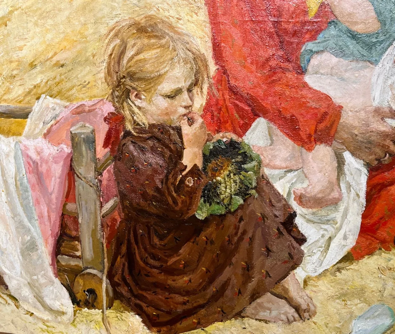 Обстановка торжественна, но нельзя не признать ощущение напряжённости: сын живописца предлагает избраннице стул. Будущая мать бледна и настолько погружена в собственные мысли, что, кажется, даже не замечает жеста заботы. А ещё, думаю, ей холодно стоять на полу босыми ногами.