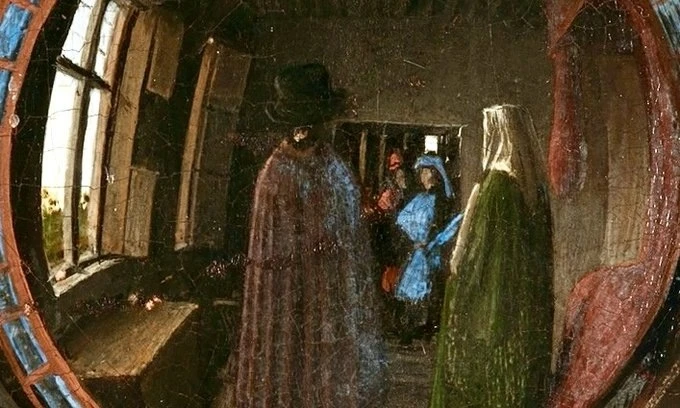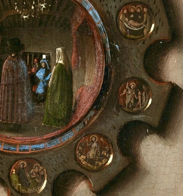 Кстати, обратите внимание на обрамление зеркала: сцены со стороны Джованни происходят при жизни Христа, а со стороны Костанцо — после смерти Христа. Это ещё один намек на посмертное написание супруги. Как и догоревшая над ее головой свеча на люстре-подсвечнике.