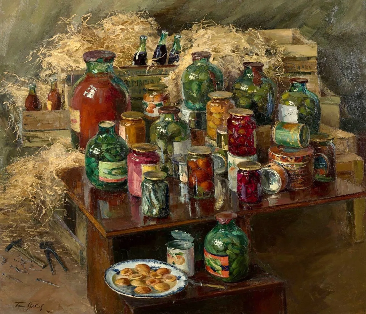 Только что извлечённые из ящиков, красиво расставленные, запечатанные сургучом закатки с маринованными огурцами, помидорами, абрикосами, сливами, килькой... Настоящие щёголи!