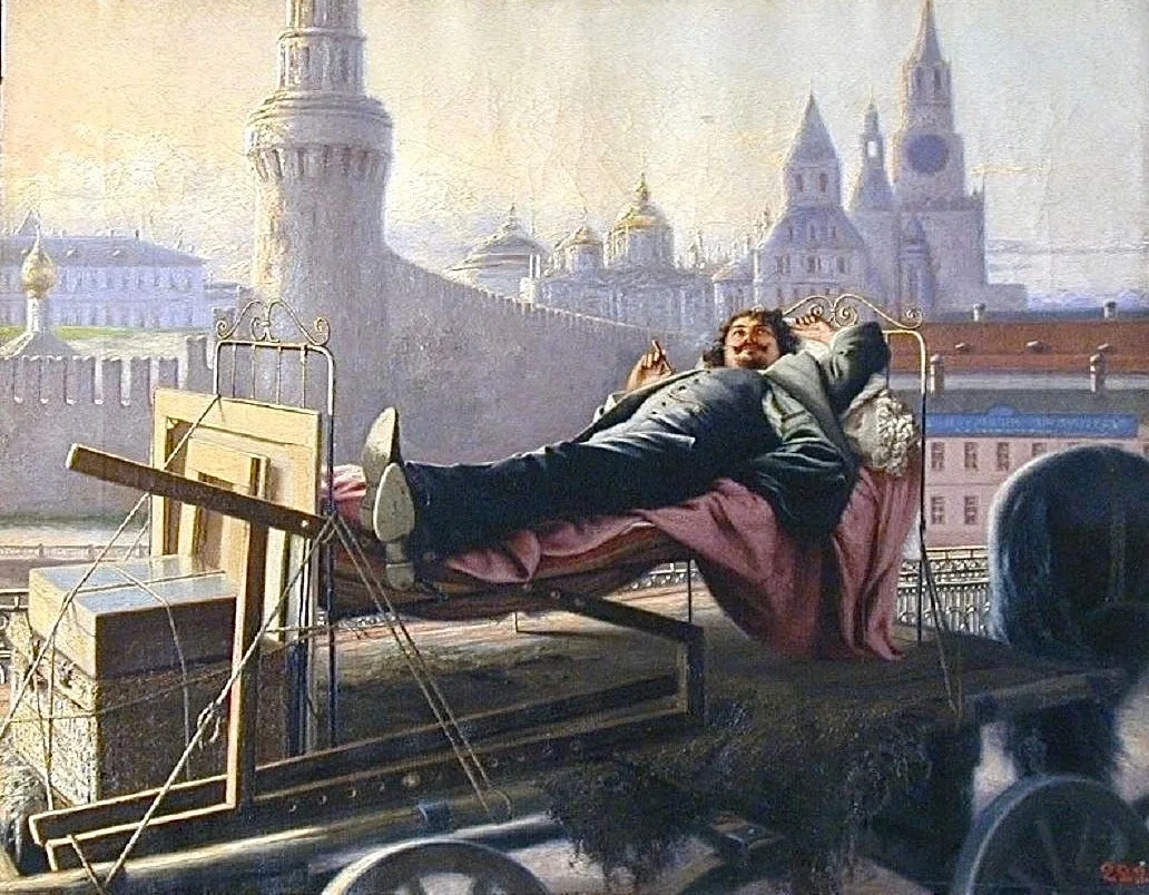Пока государь Алексей Михайлович занят партией в шахматы с одним из бояр в "Сцене из домашней жизни русских царей" Вячеслава Шварца (1865), его чёрно-белый любимец резвится с брошенными на пол фигурами.