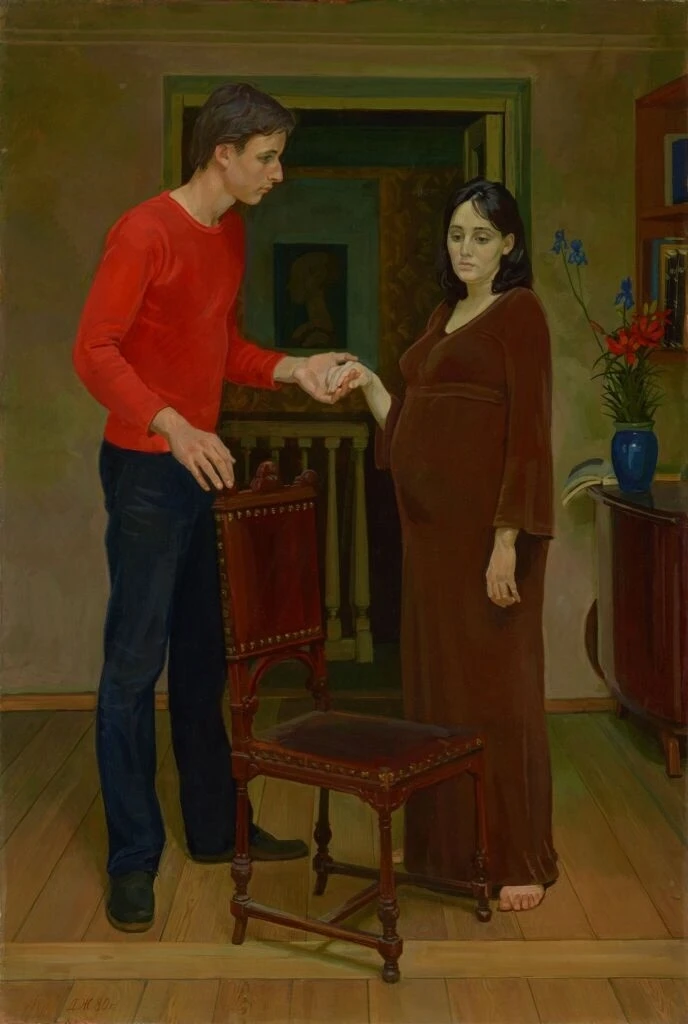 Супруги написаны в интерьерах дома художника в Ново-Бутаково, под Москвой. Молодые ждут рождения ребёнка, которое произойдёт совсем скоро. Забегая вперёд, скажу, что будет девочка. И с ней всё будет хорошо.