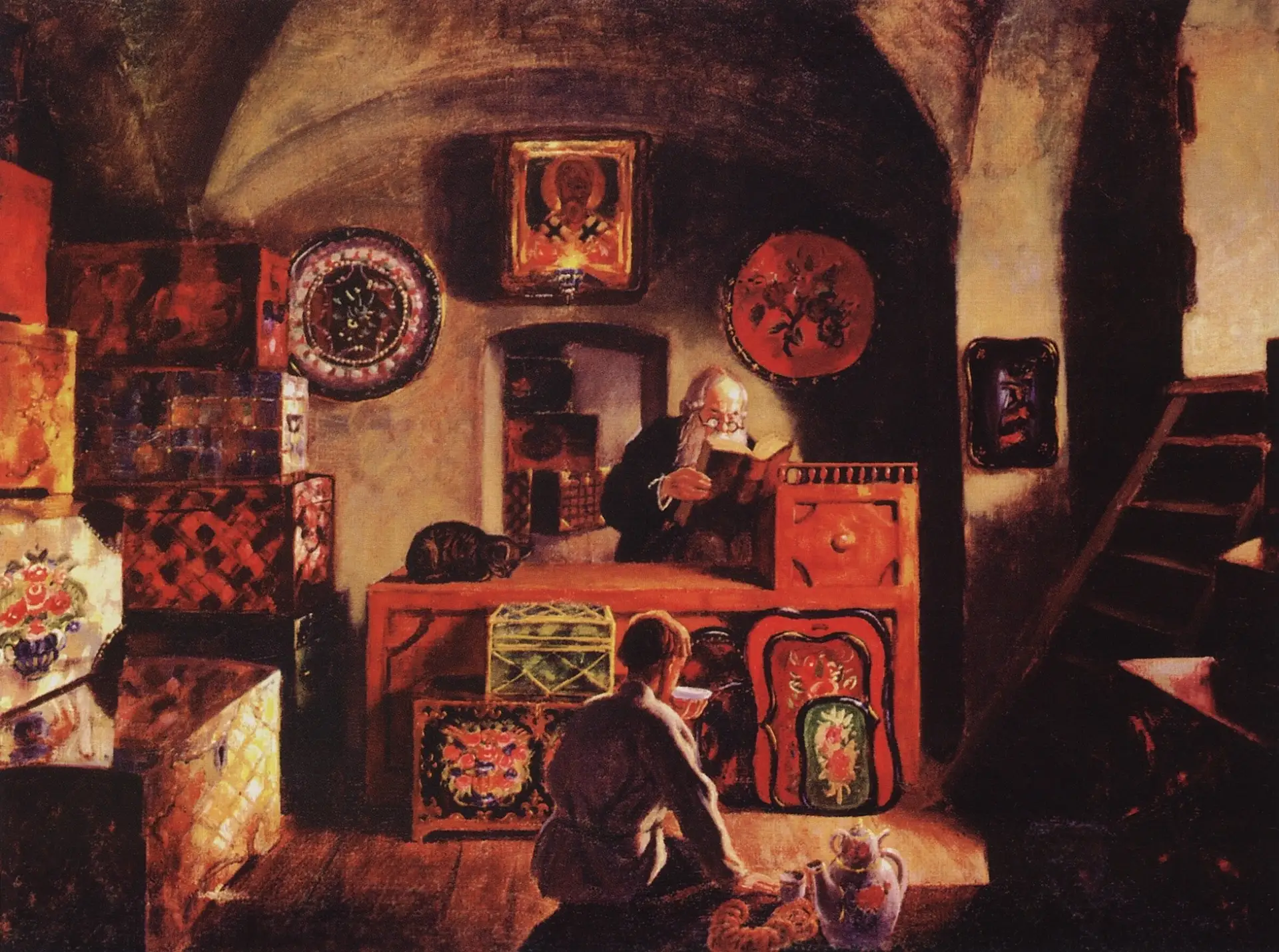 Один, почти незаметный, кемарит в мастерской "Сундучника" кисти Бориса Кустодиева, а другой уснул под неторопливое чтение "Новой сказки" на картине Николая Богданова-Бельского.