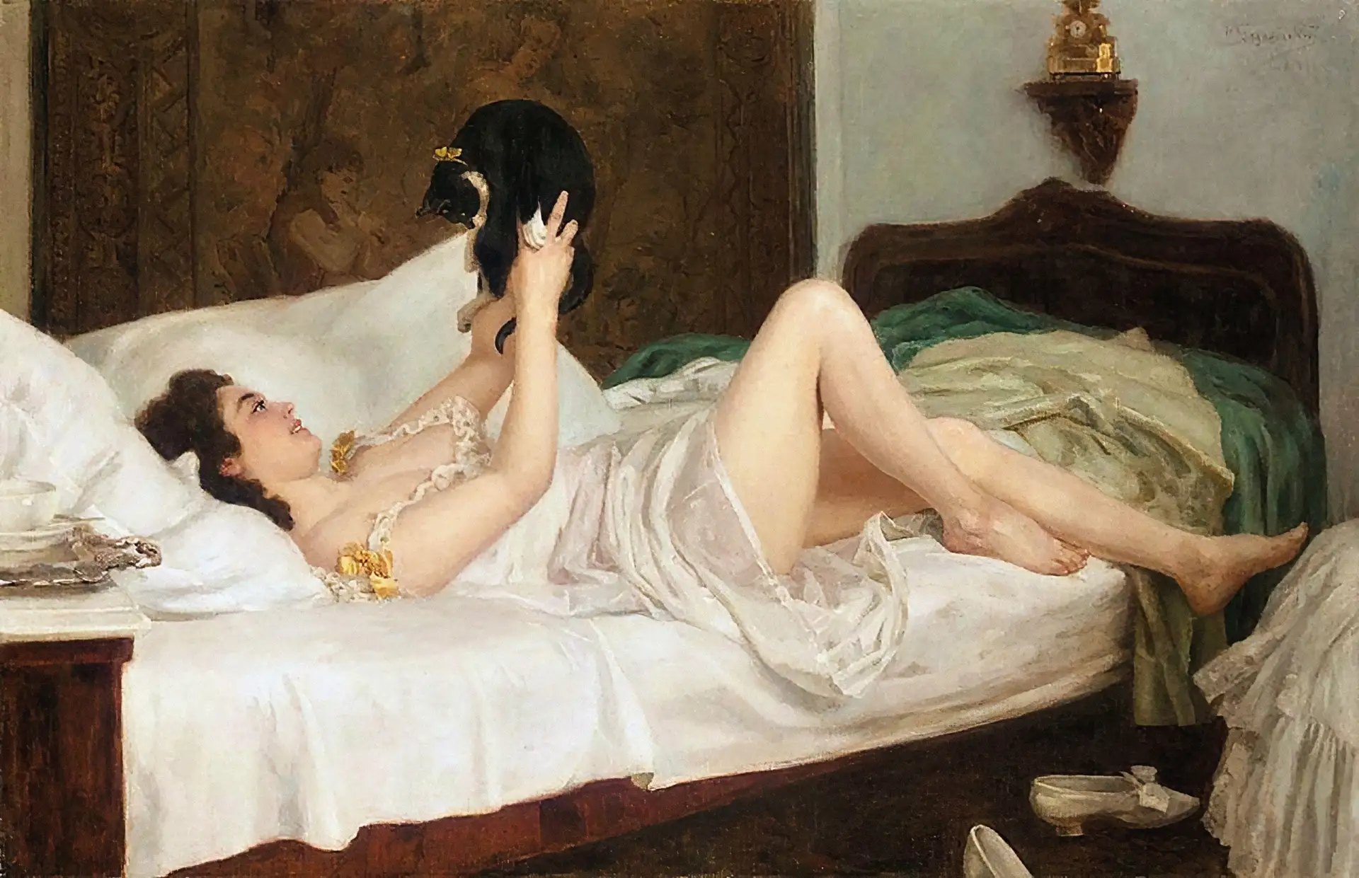 Трётся об ноги озадаченной кухарки упитанный кот на картине "Разговоры по хозяйству" Константина Маковского. Сладко спит кошечка, обнимая любимую хозяйку Софию - дочку художника Ивана Крамского в его работе "Девушка с кошкой".