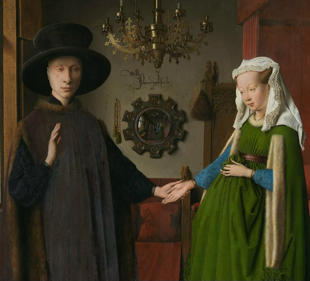 Изображённая на картине жена купца Джованни Арнольфини, полагают эксперты, тоже написана беременной или непременно ожидает оказаться в этом статусе: подобные платья тогда были в моде, а изображение округлостей на портретах предвещало скорое исполнение ожиданий.