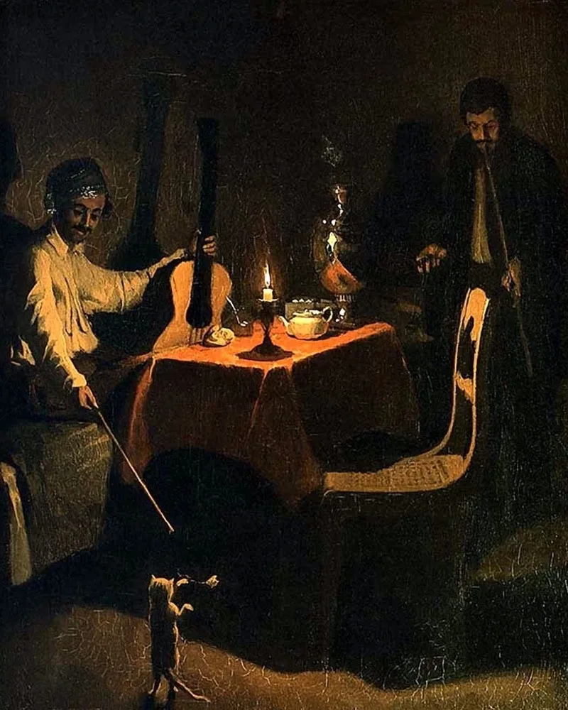 Кто-то в полумраке развлекает денщика и офицера (вероятно, самого автора картины - Павла Федотова) в неоконченной одноимённой сценке, а кто-то нашёл клубок ниток в люльке "Первенца" Ивана Пелевина.