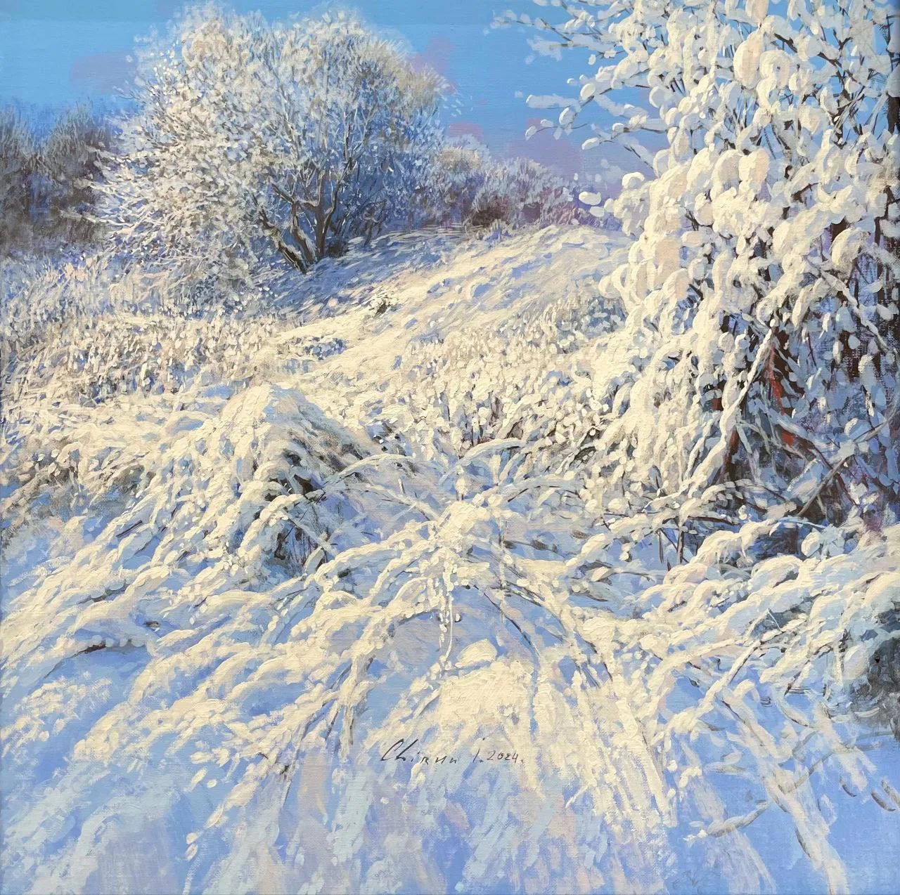 На картине изображён зимний пейзаж в одном застывшем мгновении. Солнце восходит, оставляя за собой тропинку света на холодном горизонте. Несколько иссиня-ледяных деревьев будто хранители спокойствия застыли справа, оберегая тайну зимнего сна природы.