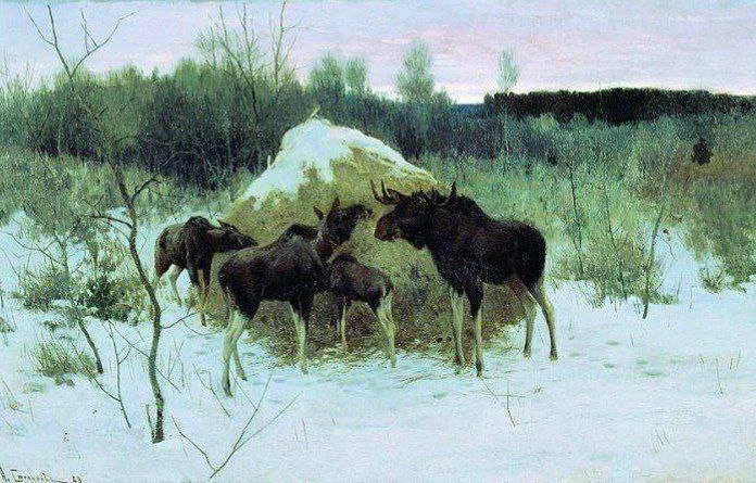 На переднем плане находятся лоси, которые вышли из тёмного леса, виденного вдалеке. Завидев целый стог сена, который заготовили люди, лоси решили полакомиться душистым сеном. Лось и лосиха привели двух лосят, чтобы те подкрепились и набрались сил, ведь зима для животных — сложное время года. Два лосёнка с удовольствием едят вкусное сено.