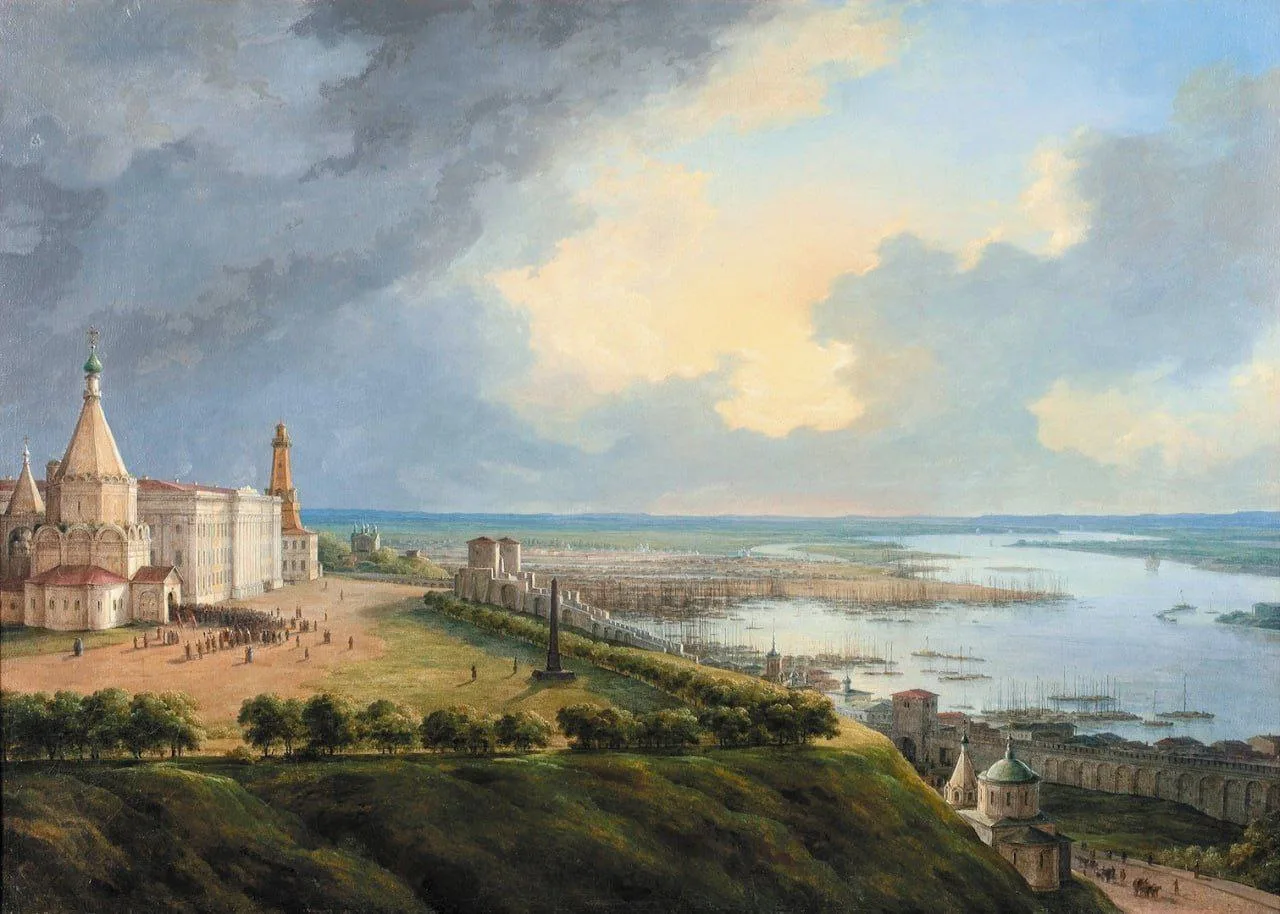 Такой ракурс позволил ему запечатлеть не только архитектуру нижегородского кремля, но и широкую панораму реки с отмелями, уходящими к линии горизонта. Автор отразил ландшафт топографически точно, но при этом не лишил картину поэзии — он изобразил бледно-голубое небо с темнеющими облаками, водные дали в месте слияния Волги и Оки, нежную зелень на переднем плане.