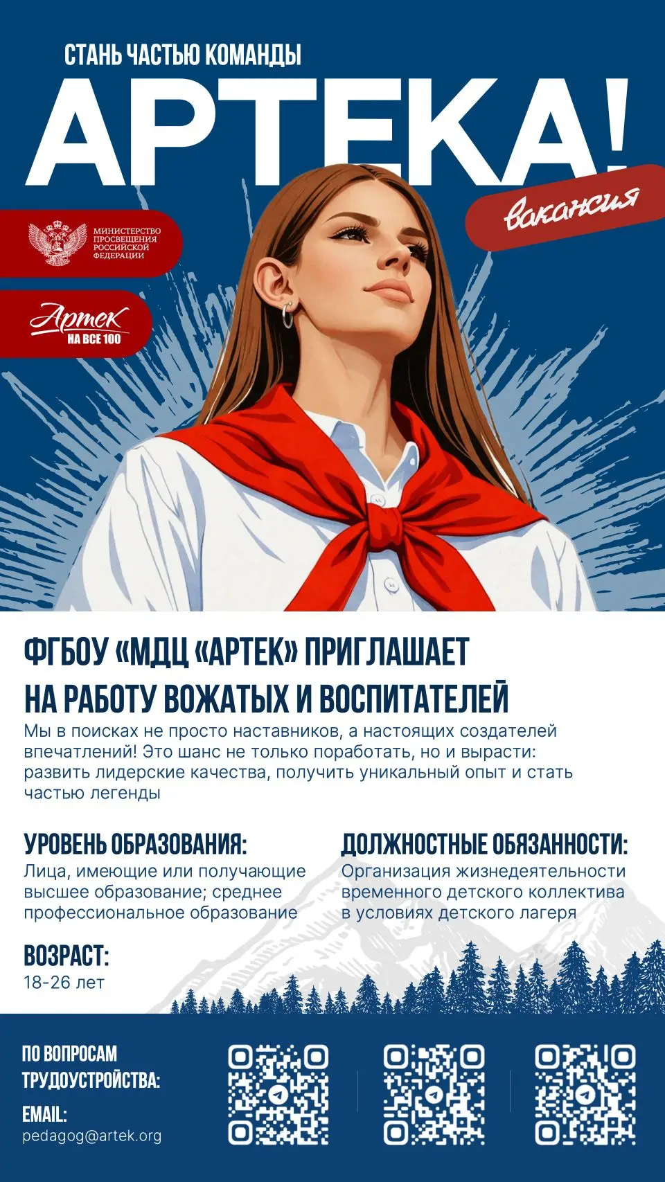 📢 Спешим поделиться прекрасной возможностью и пригласить студентов и выпускников образовательных организаций стать частью команды вожатых и воспитателей Международного детского центра «Артек».