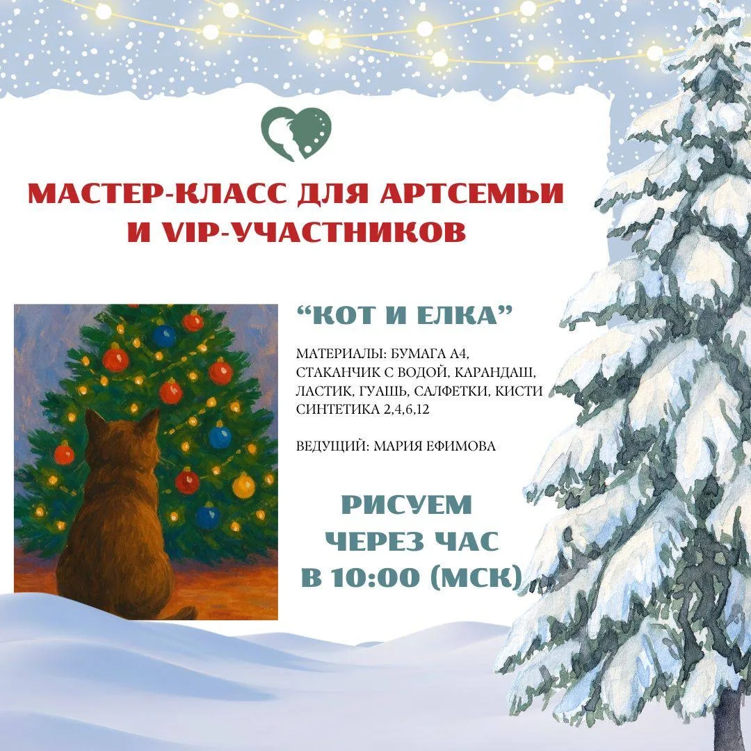 Дорогие художники, «АртСемья» и VIP-участники — УЖЕ ЧЕРЕЗ ЧАС к нам в эфир выйдет прекрасная Мария Ефимова, чтобы мы вместе поработали с гуашью, насладились праздничным настроением и создали чудесный новогодний сюжет🎄