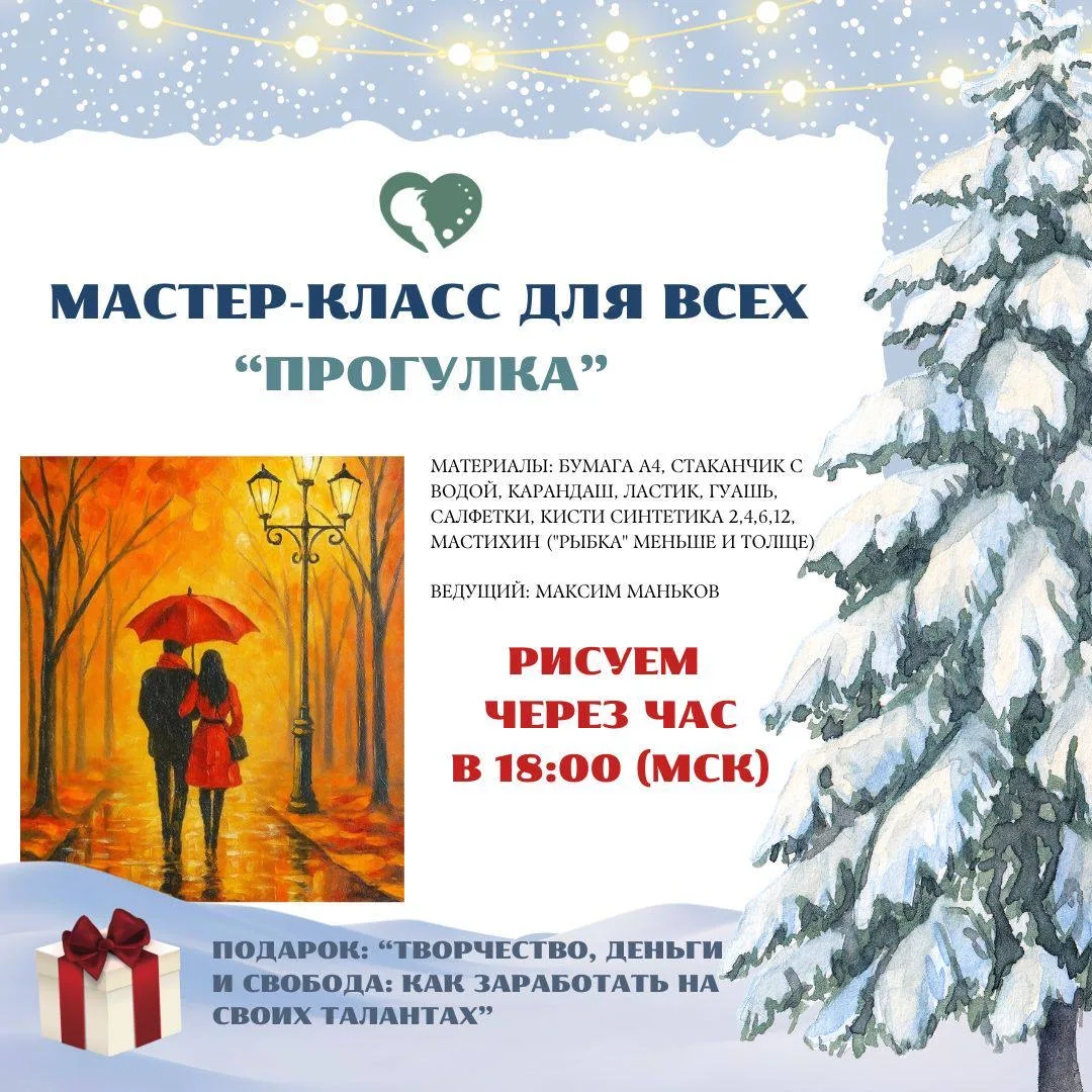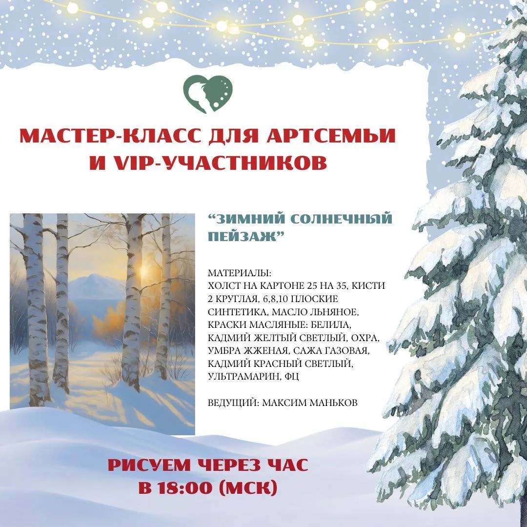 …заключительный мастер-класс Новогодней Ярмарки Рисования 2026, Максим Маньков, вечернее творчество, море вдохновения, работа с маслом, зимний солнечный пейзаж и всё это УЖЕ ЧЕРЕЗ ЧАС - ровно в 18:00 по московскому времени!