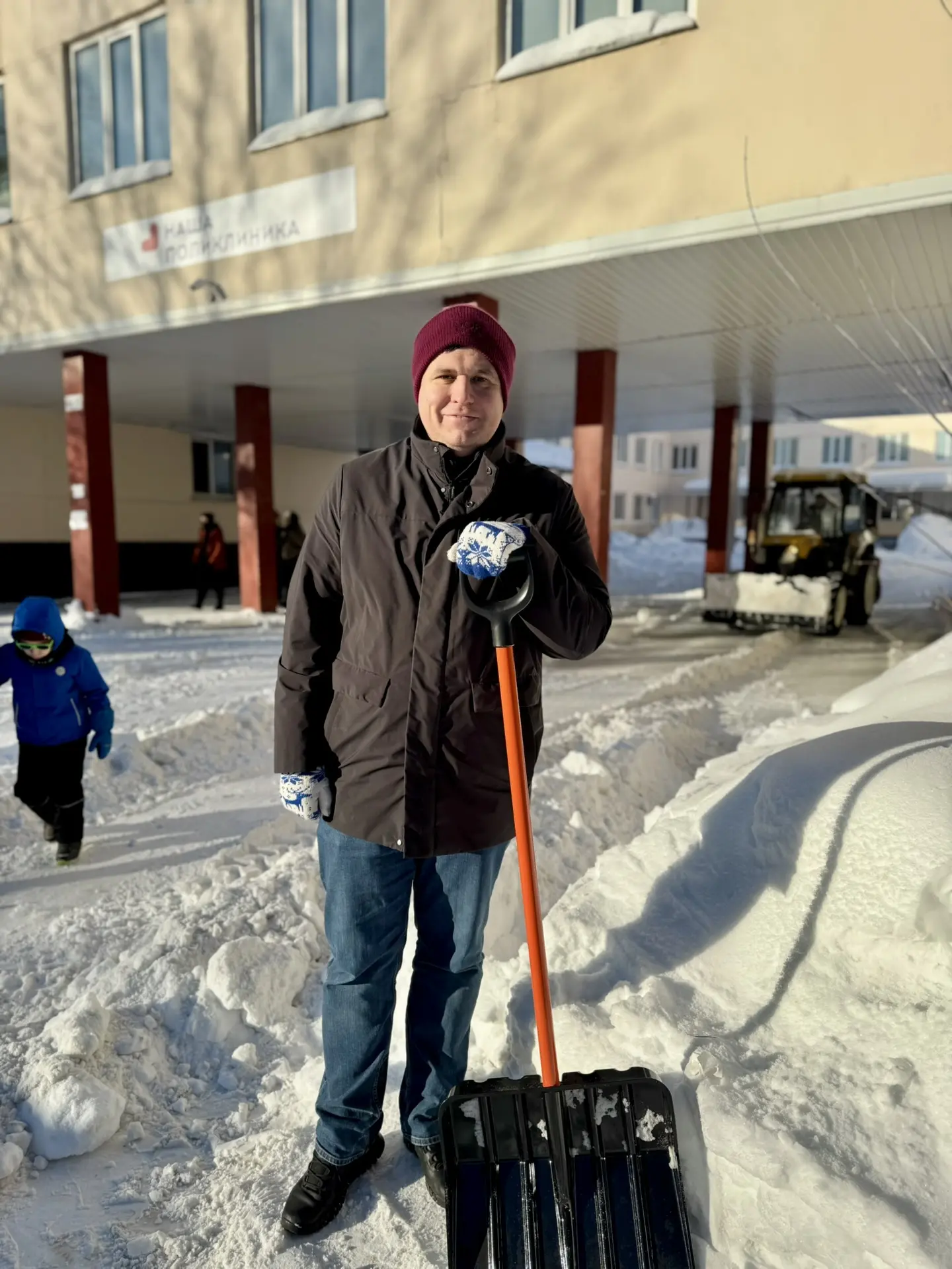 Малыши с родителями ещë утром пробирались в поликлинику по тропинкам, а теперь уверенно топают обратно по расчищенной площади. Неравнодушные жители, партийцы, молодогвардейцы с инвентарëм и техникой справляются с последствиями продолжительного снегопада.