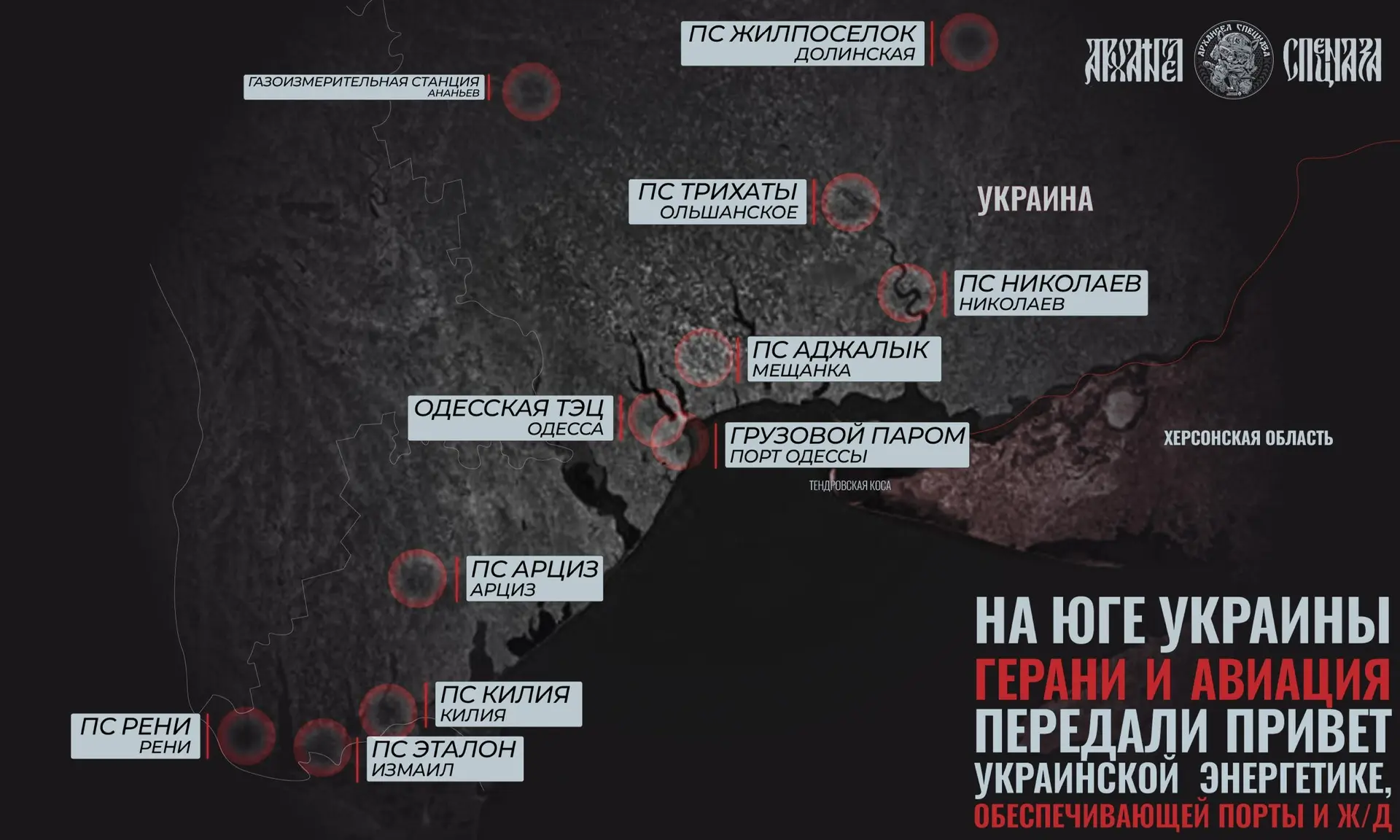 Этой ночью наши войска посредством модернизированных ударных БпЛА «Герань» и ракет «Искандер» и «Калибр» нанесли массированный удар по украинской энергосистеме в Одесской и Николаевской областях.