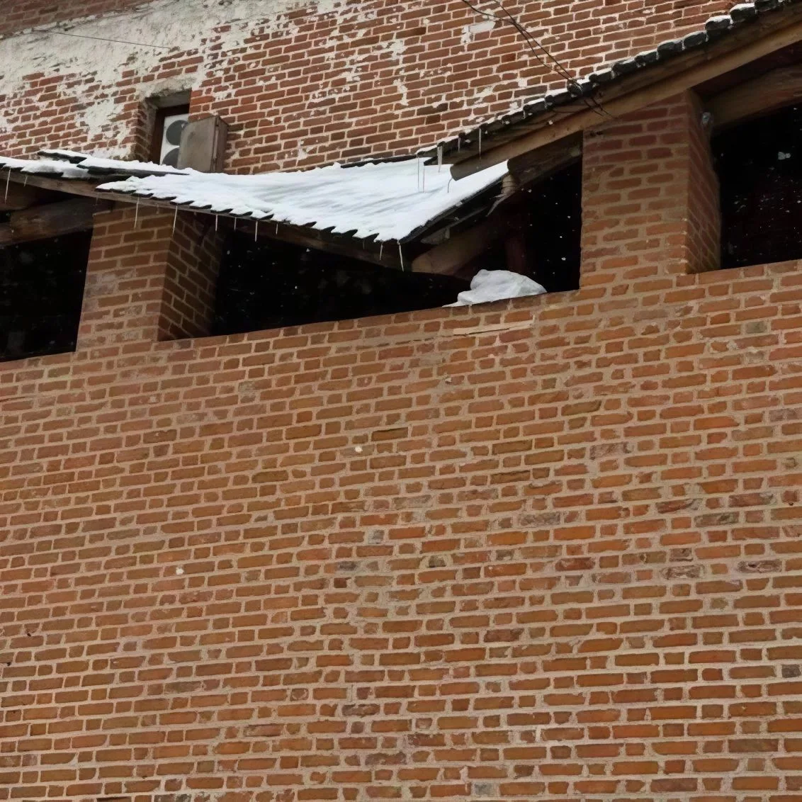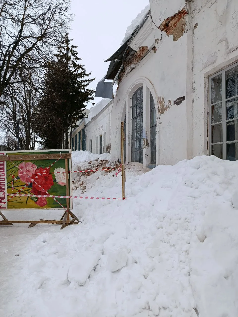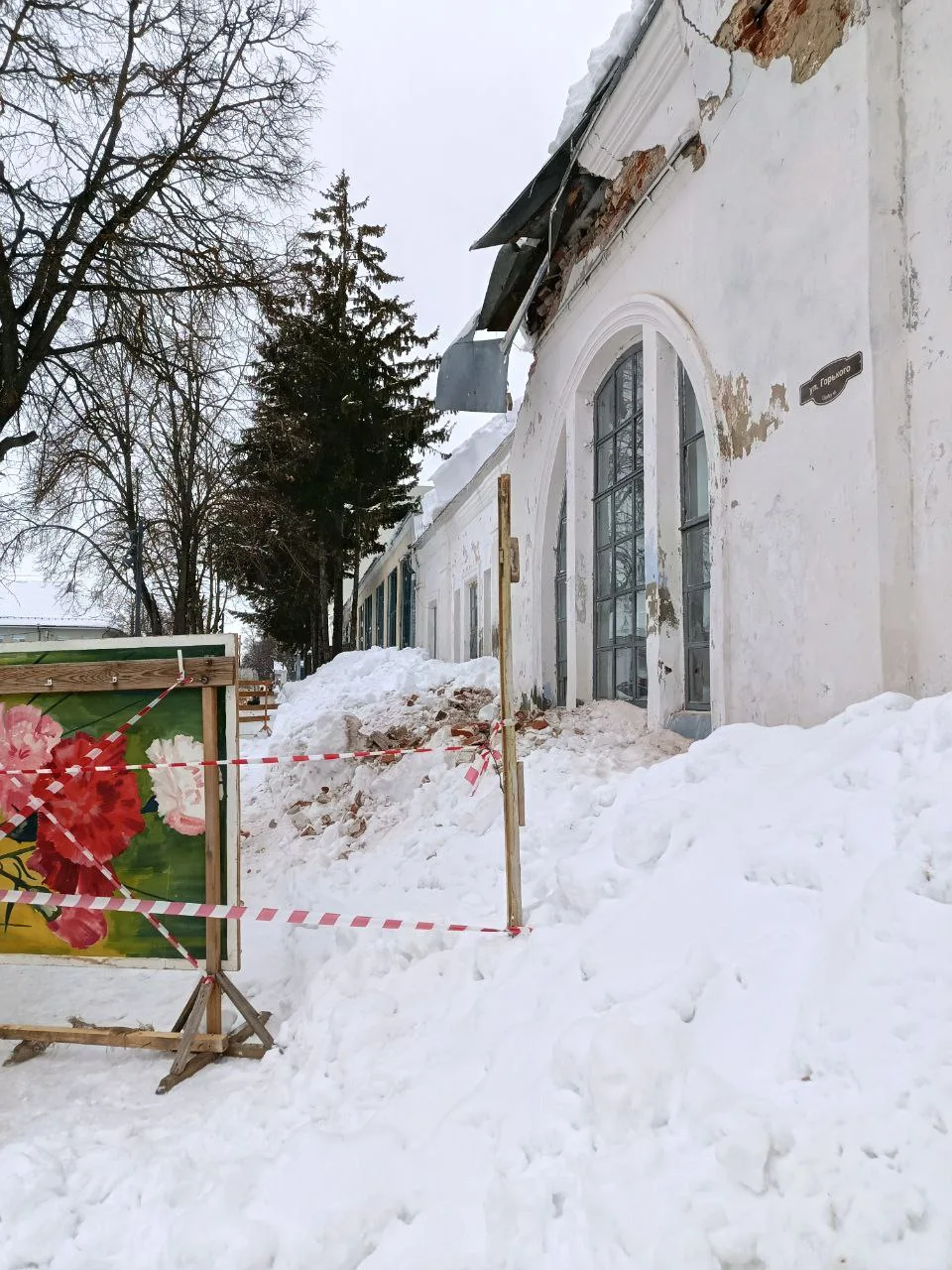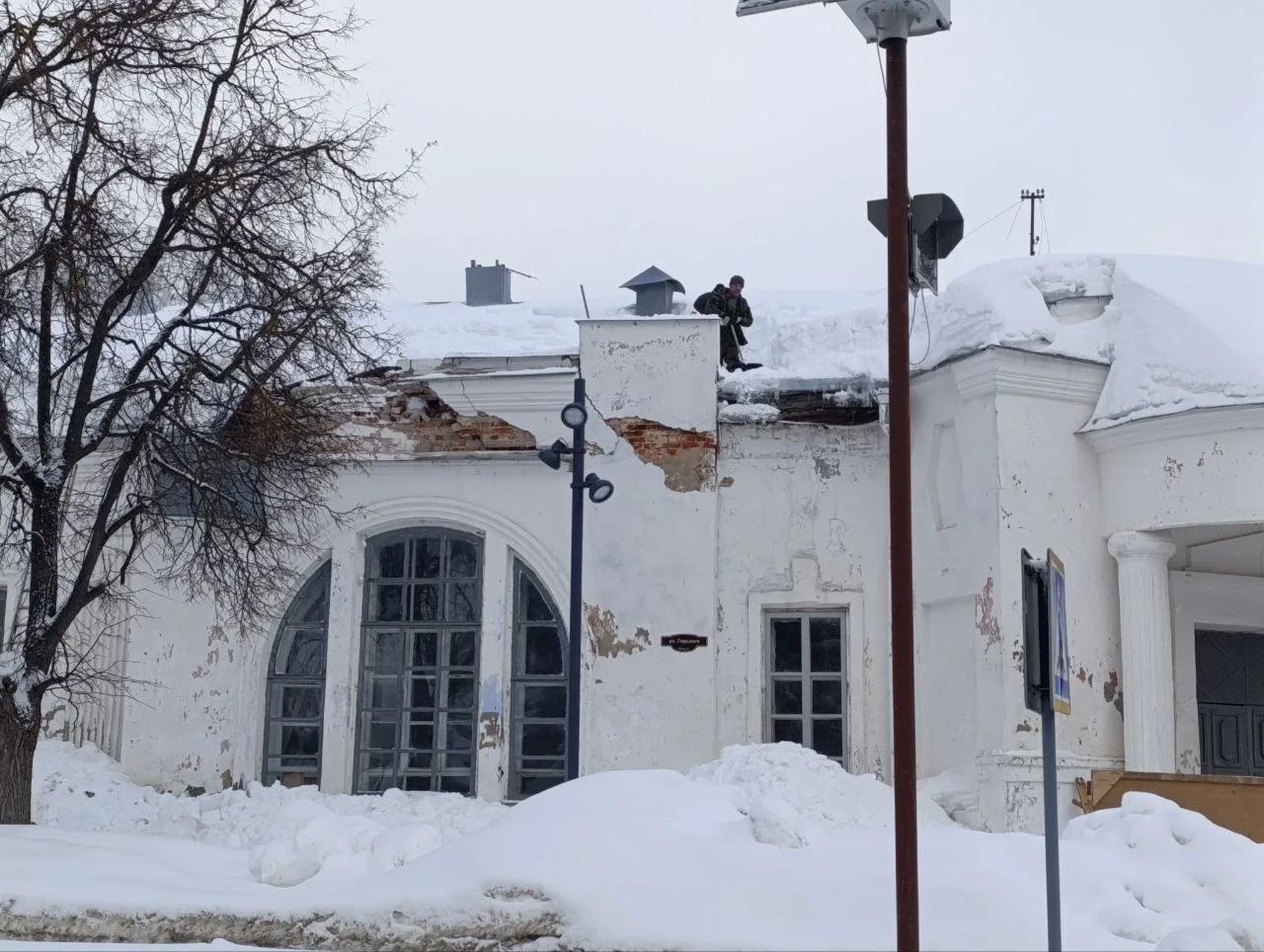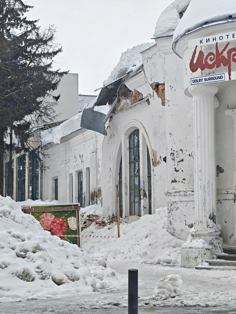 Из-за схода снега пострадала кровля кинотеатра "Искра", который является объектом культурного наследия регионального значения. В результате этого, произошла частичная утрата кладки, что привело к серьезным повреждениям здания!
