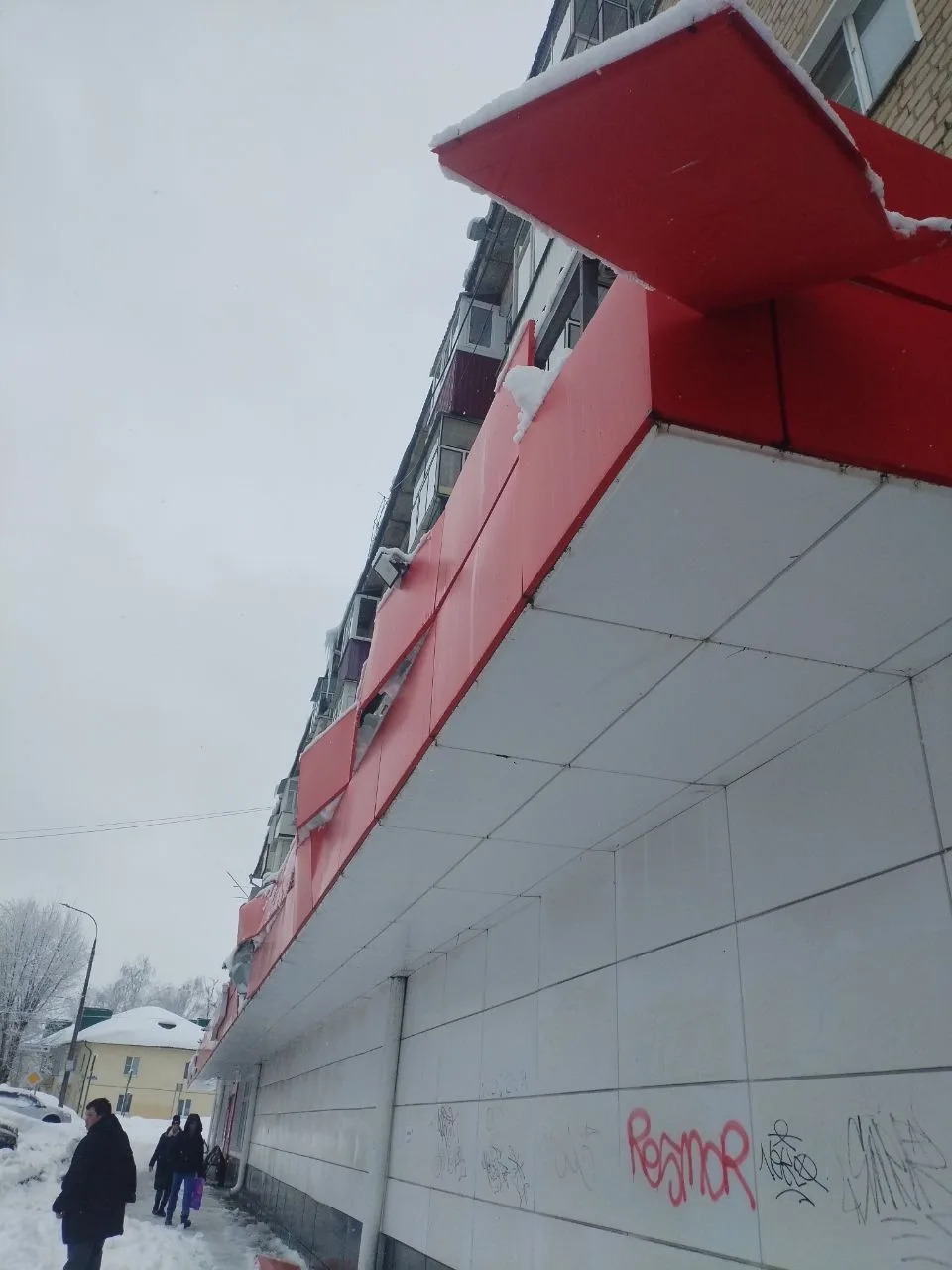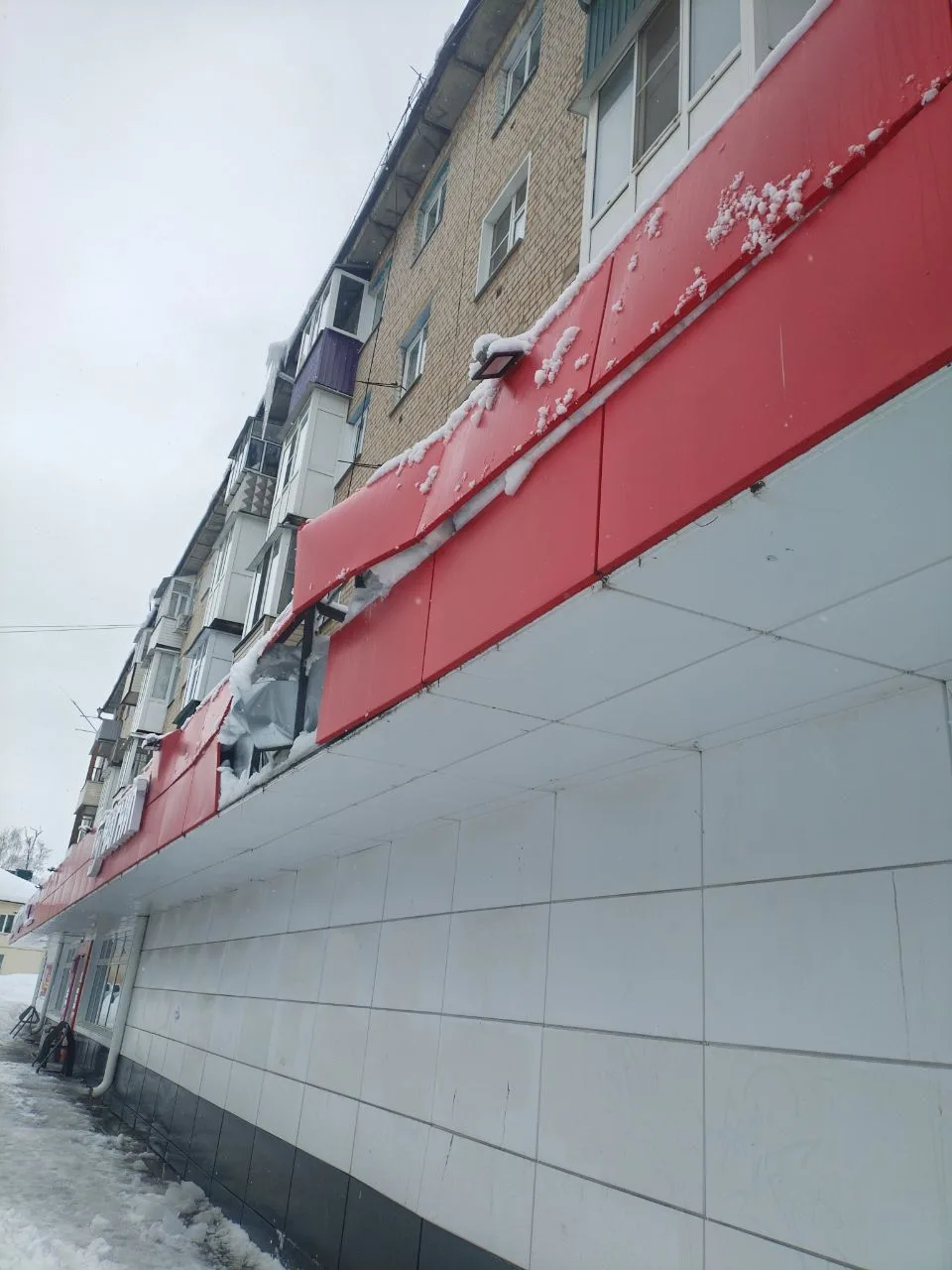 Вот так разворотило козырек магнита на ул. Нижегородская из-за схода снега!