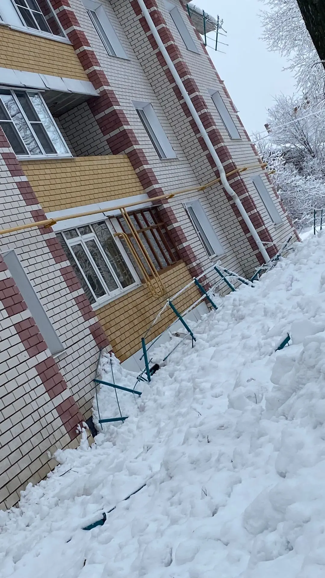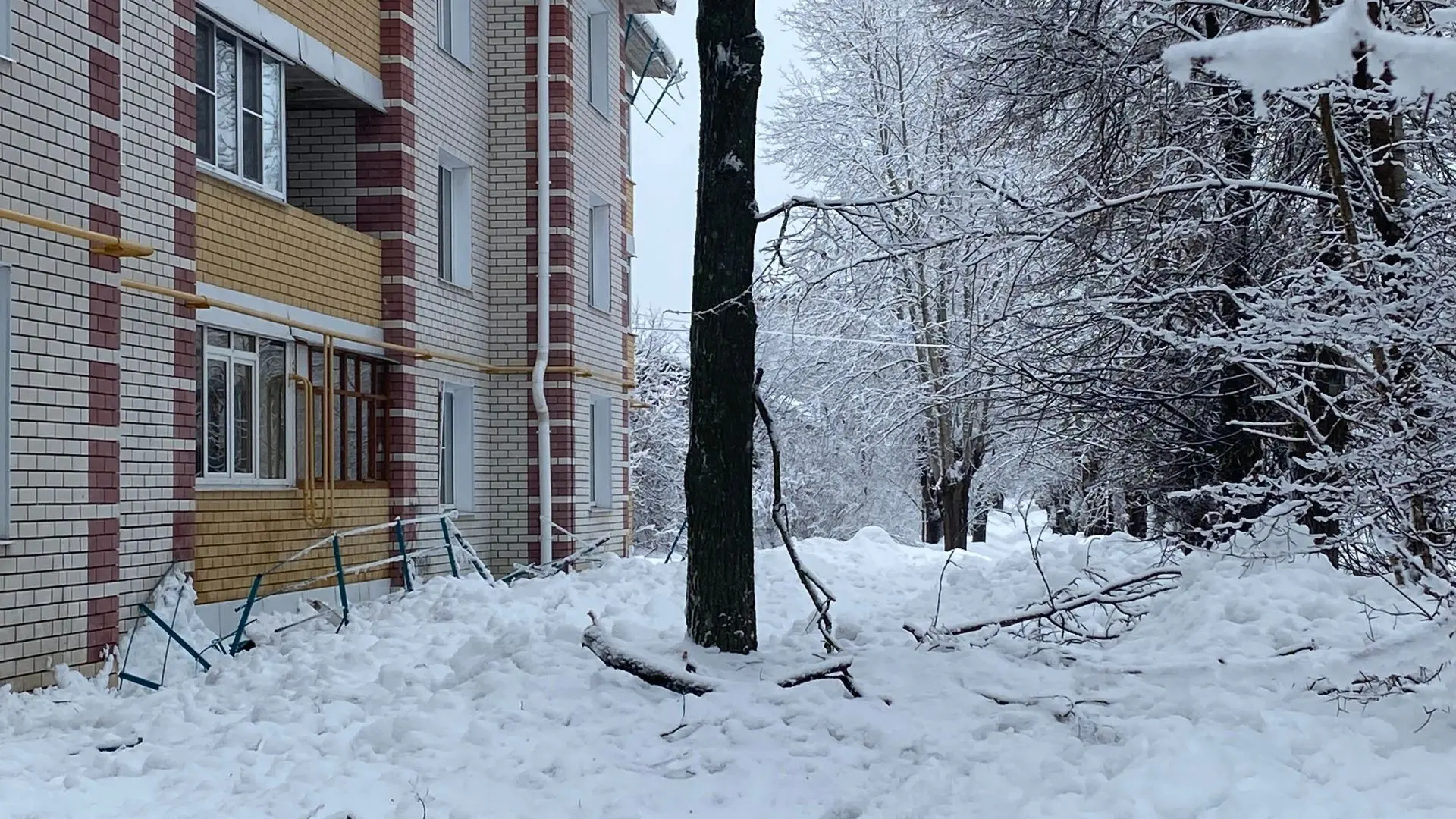 Не только проезды к дому оказались заблокированы снежными завалами, но и сломаны деревья, тротуары рядом недоступны для прохода, снесено тяжелое металлическое ограждение с дома…