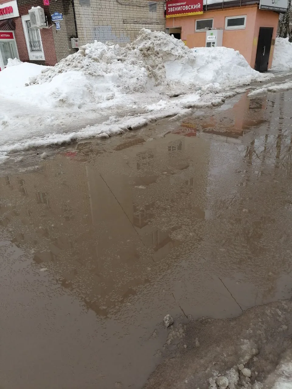 «Поворот с ул. Парковой во дворы между 26 и 28 домами полностью заблокирован огромным потопом. Пройти невозможно.»