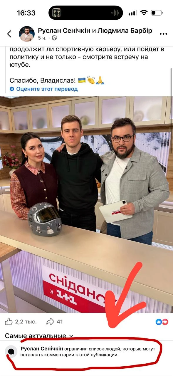 После моего корректного на украинском языке вопроса о том, передает ли он собранные 750 000 долларов семьям погибших на шлеме, при помощи которых «заработал» эти деньги и после того, что после этого началось, пропагандон с 1+1 закрыл комменты.