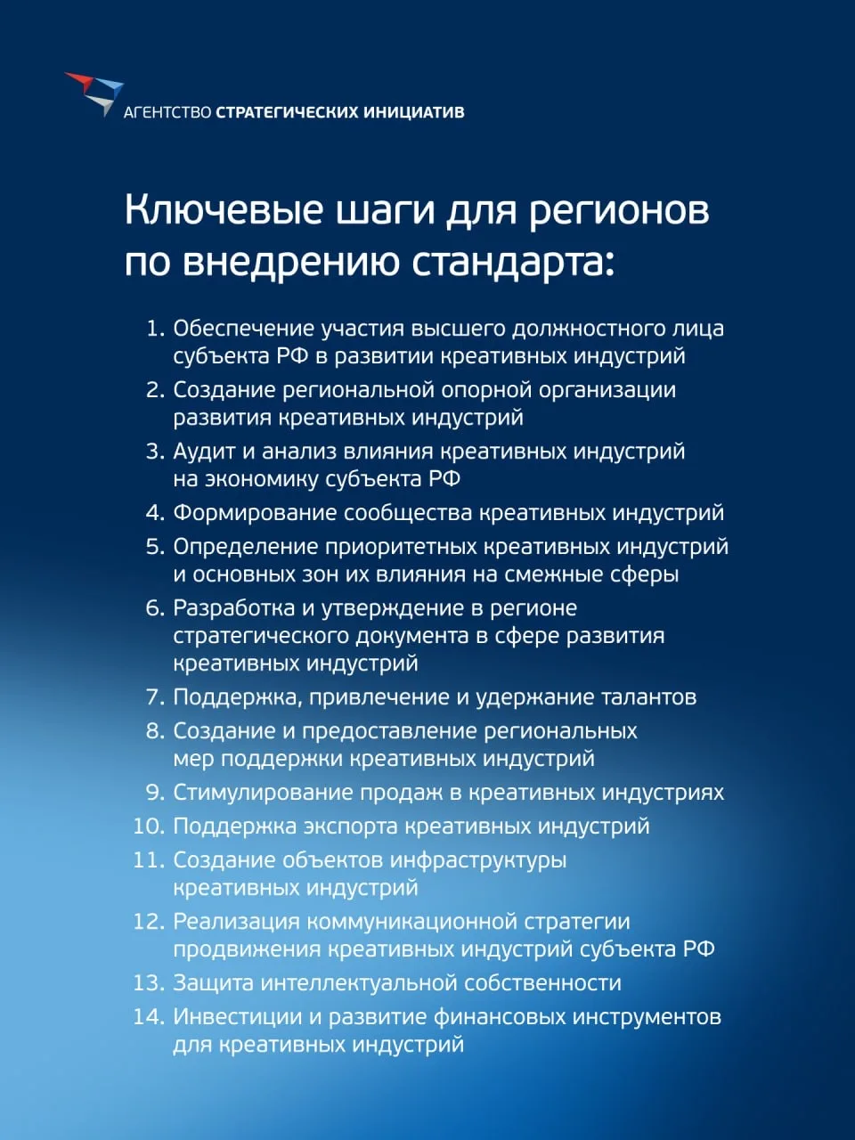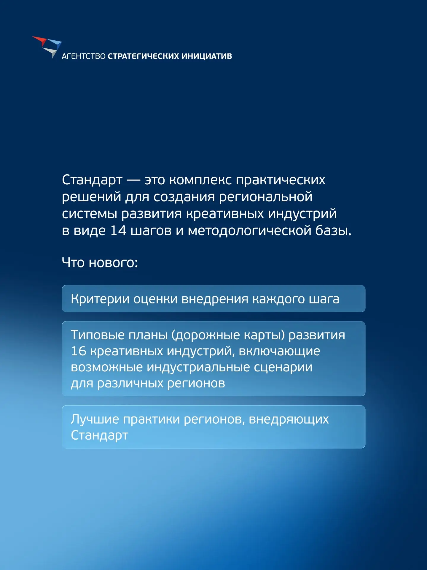 Региональный стандарт развития креативных индустрий разработан АСИ по поручению Президента России. Все регионы, внедряющие Стандарт, автоматически переходят на вторую редакцию с даты ее утверждения.