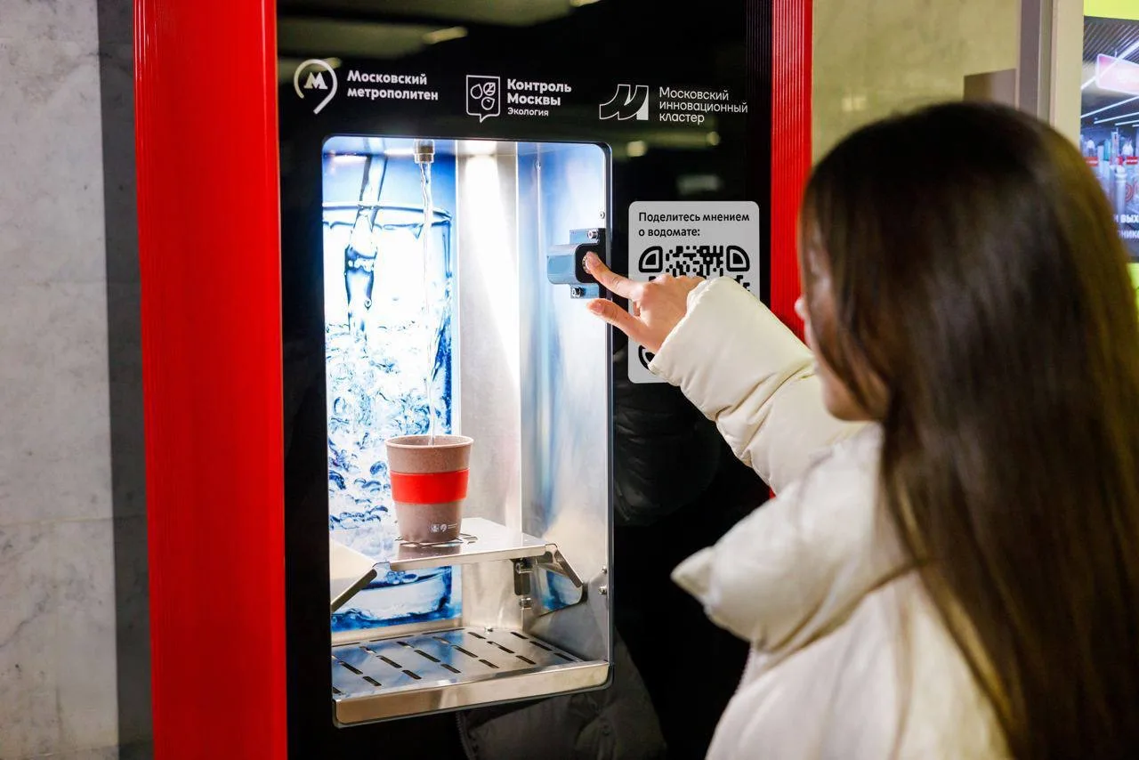 На станции «Комсомольская» появился первый в московском метро водомат с бесплатной питьевой водой — его корпус полностью напечатан из вторсырья.