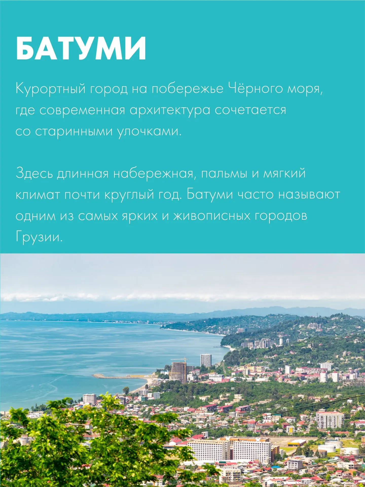 Батуми — один из самых ярких городов на Чёрном море. Здесь современная архитектура гармонично сочетается со старым городом, уютными улочками и южным колоритом.