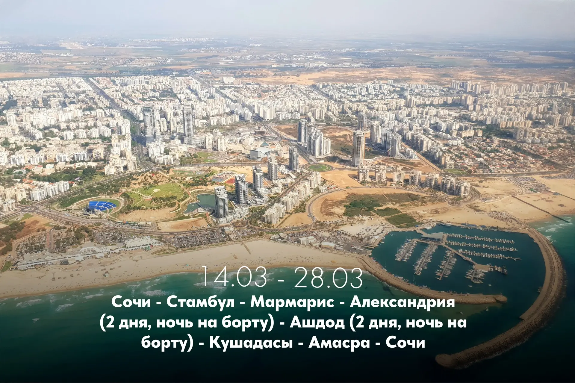 Сочи — Стамбул — Мармарис — Александрия (2 дня, ночь на борту)— Ашдод (2 дня, ночь на борту) — Кушадасы — Амасра — Сочи
