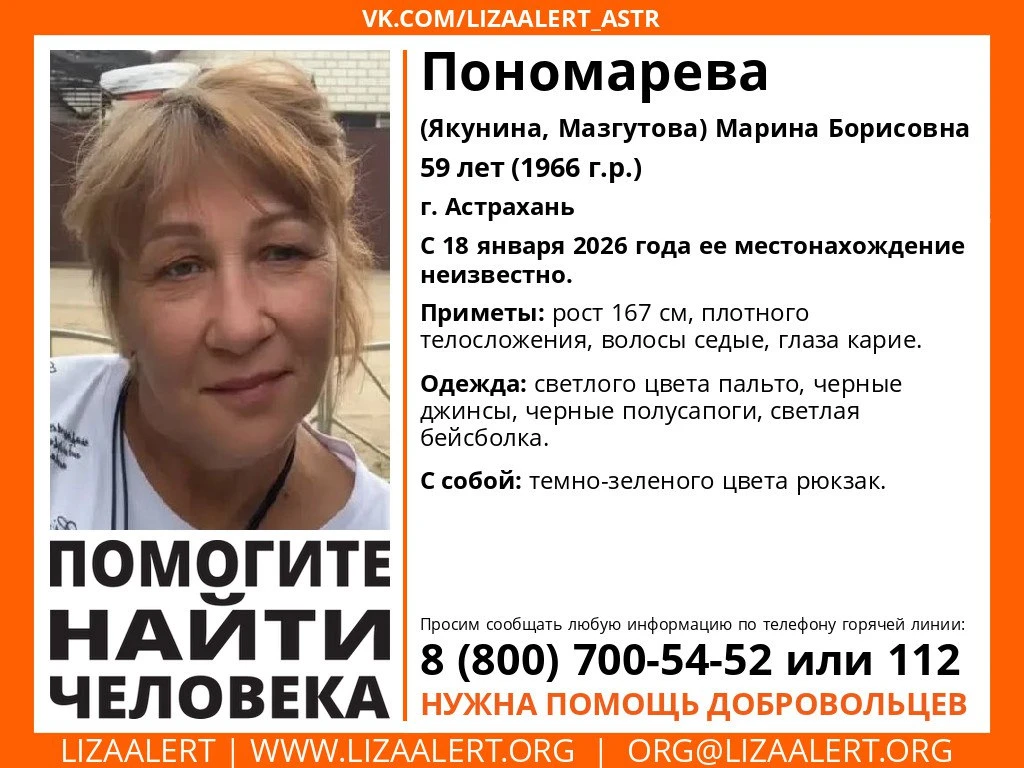 По информации поискового отряда ЛизаАлерт, с 18 января 2026 года неизвестно местонахождение Марины Борисовны Пономарёвой (также Якунина, Мазгутова), 59 лет. Женщина проживает в Астрахани.