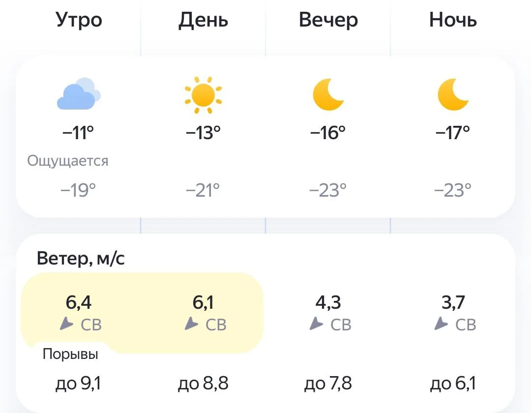 Сейчас температура воздуха -11°C, вечером похолодает до -16°C, ветер — 3-6 м/с, атмосферное давление — 780 мм рт. ст.