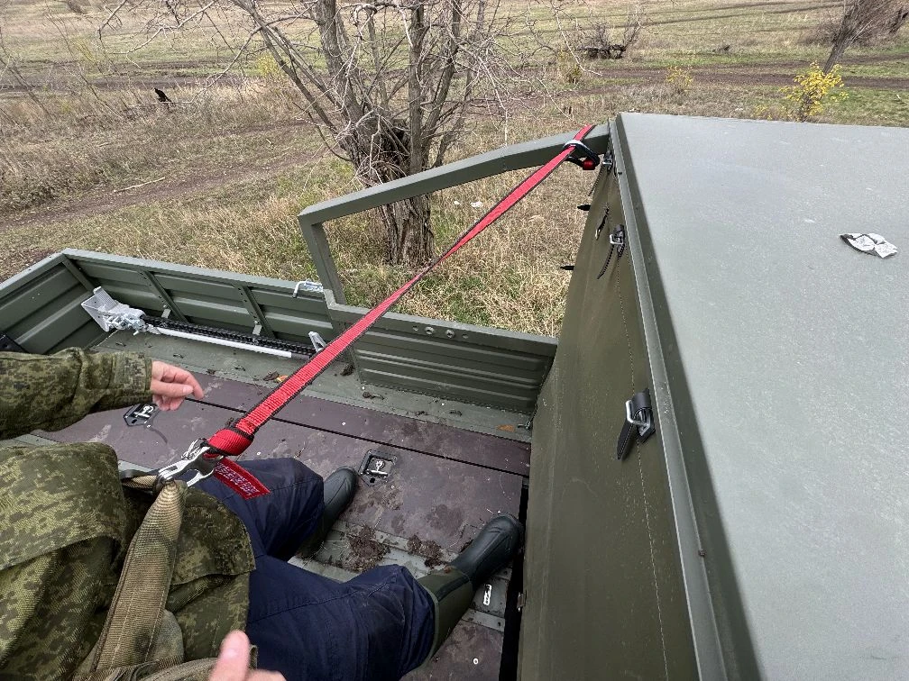 И снова о важном. Есть такая вот штука, страховочный ланъярд. Она поможет не только от выпадения из машины, но и для работы в кузове. Я на Улане закрепил его за одну из петель на полу, но есть и другие способы.