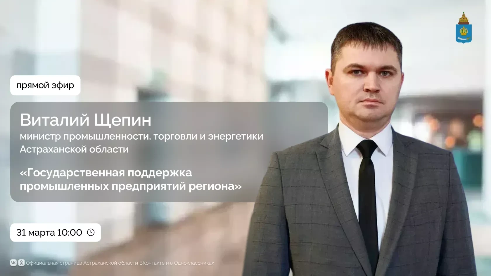 Министр промышленности, торговли и энергетики Астраханской области Виталий Щепин в прямом эфире расскажет о государственной поддержке, которую оказывают в регионе промышленным компаниям.