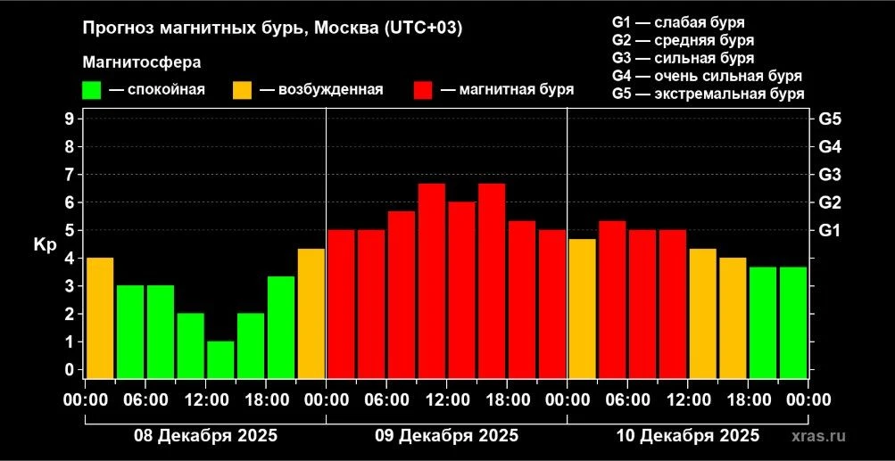 Пик придется на вторую половину дня 9 декабря. Геомагнитные возмущения продлятся до 11 декабря.