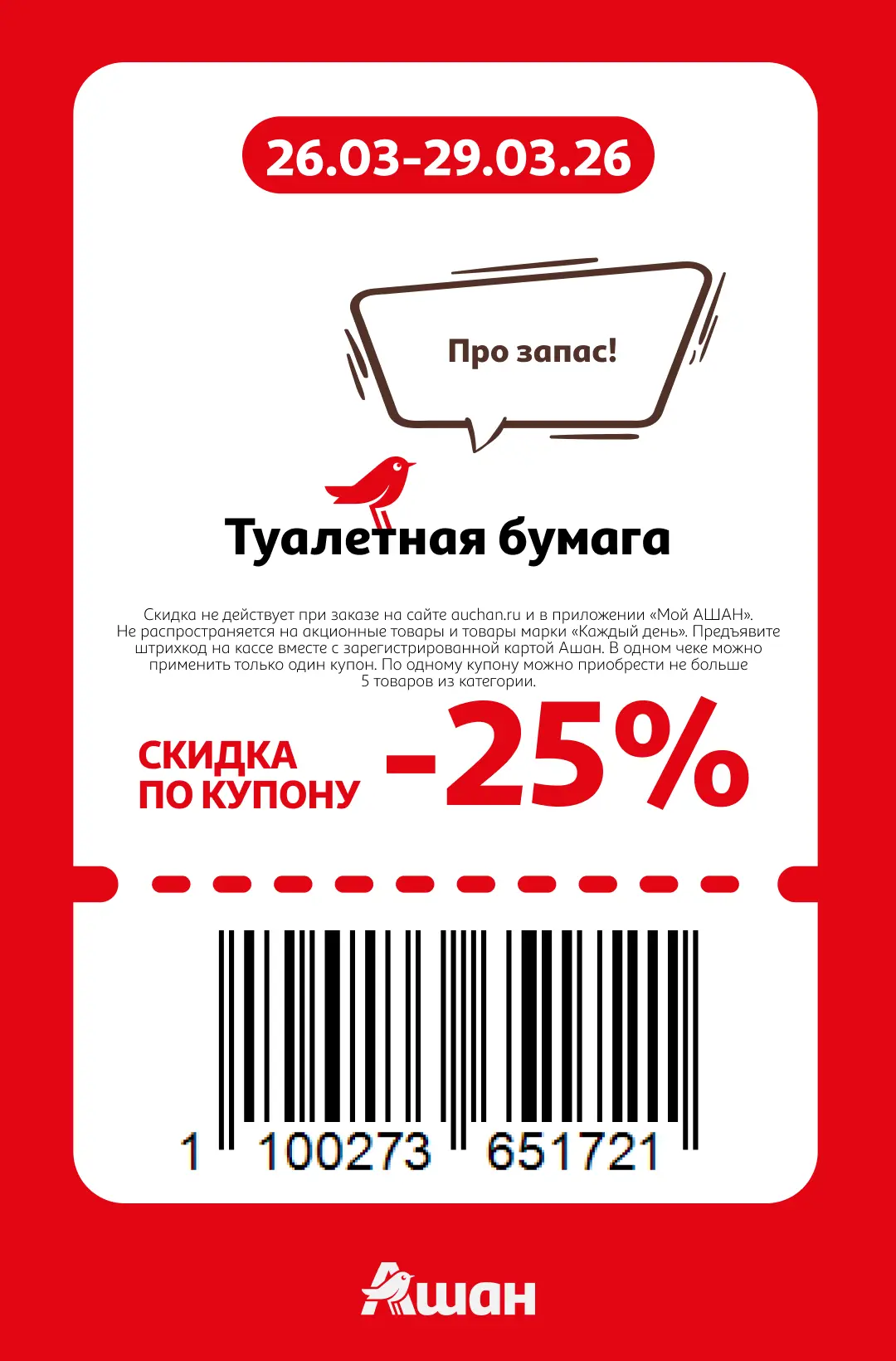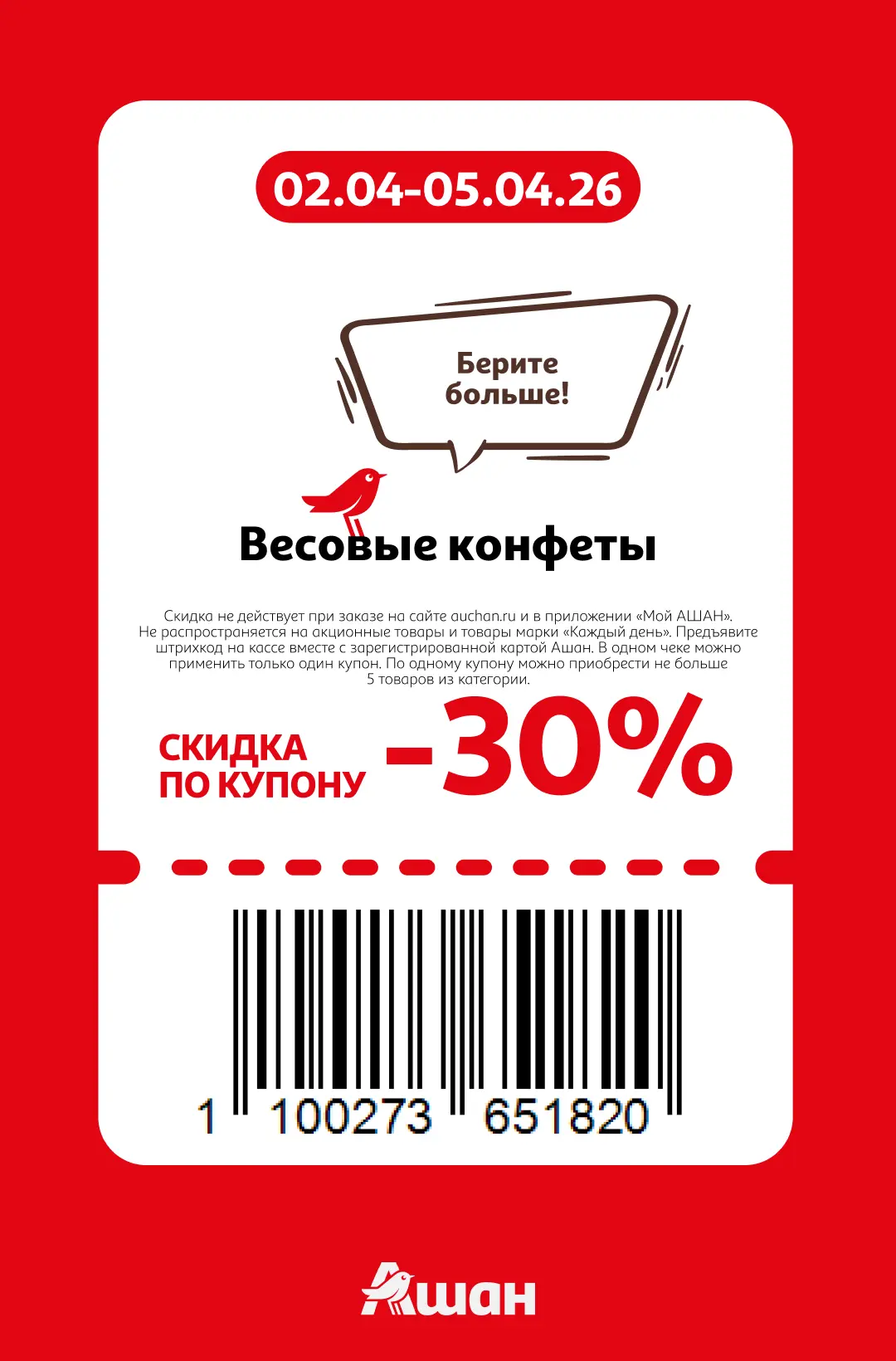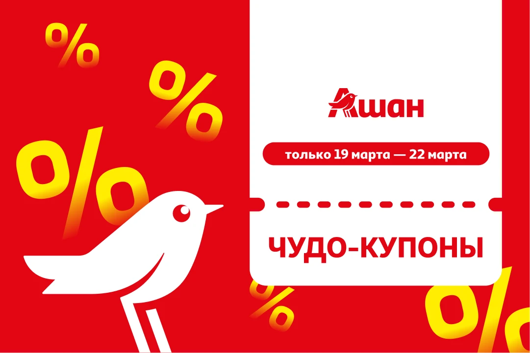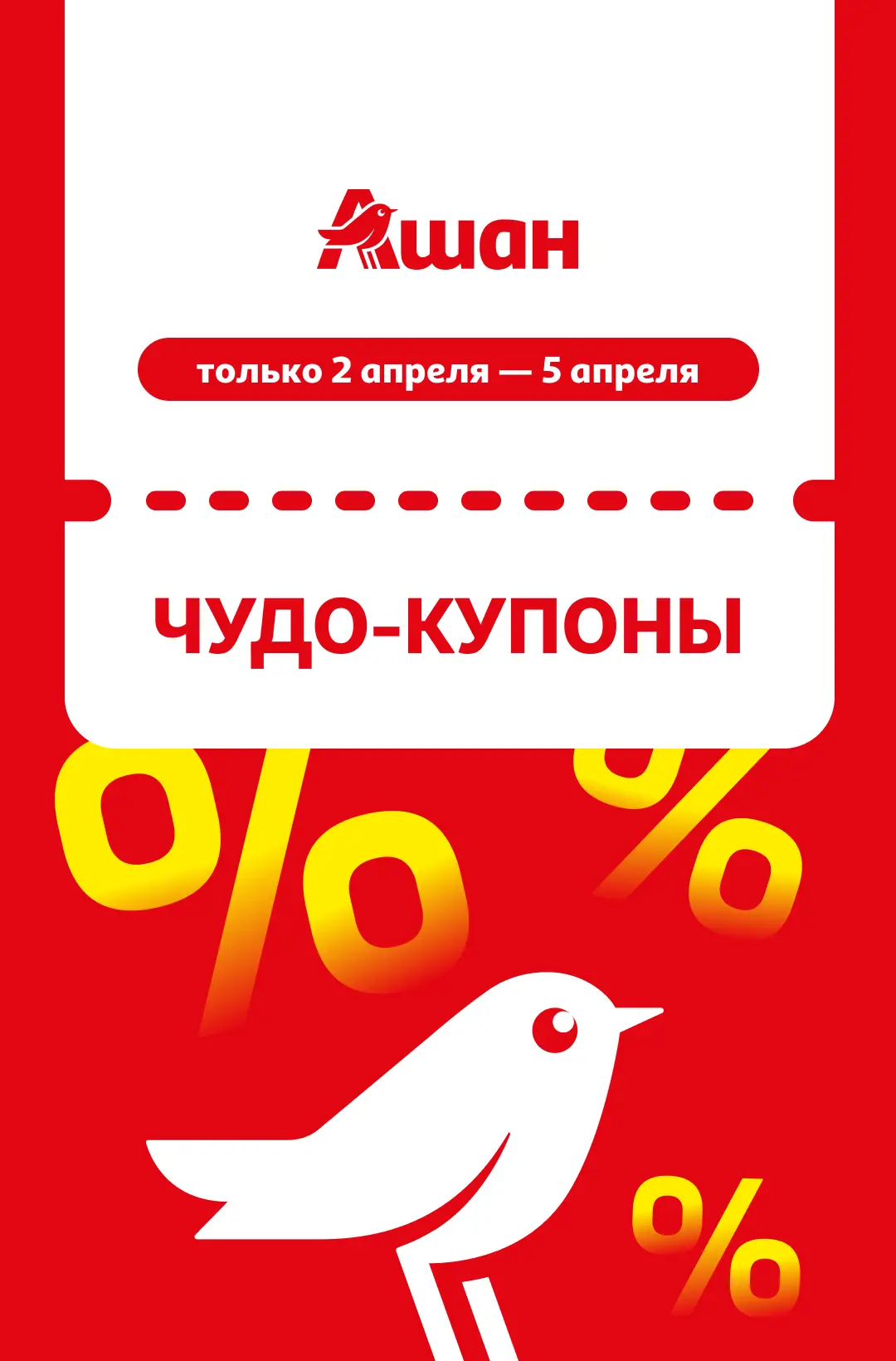 *Купоны можно применить только при предъявлении зарегистрированной карты Ашан. В одном чеке можно применить один купон. Не действуют на заказы на сайте и в мобильном приложении. По купону можно приобрести ограниченное количество товаров.