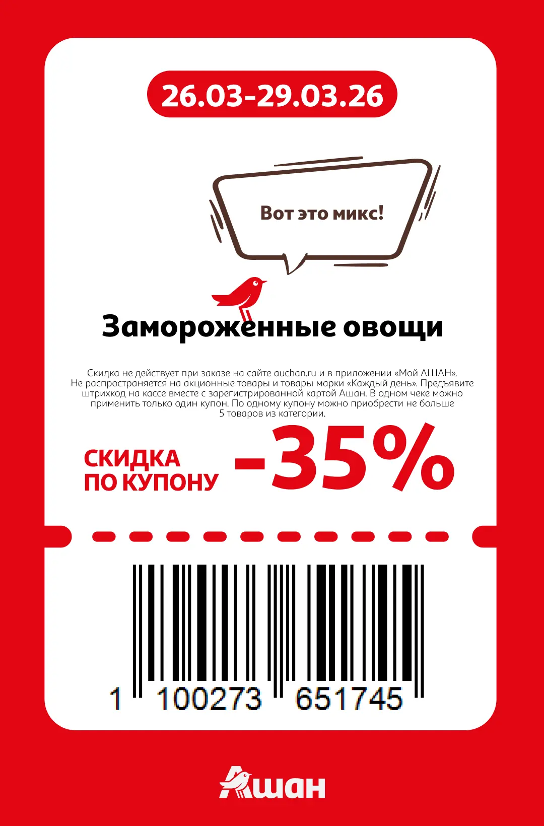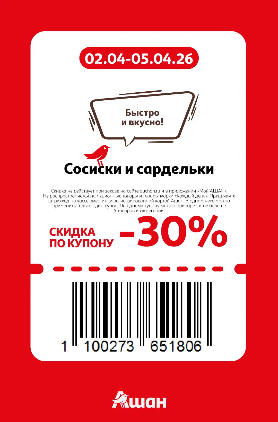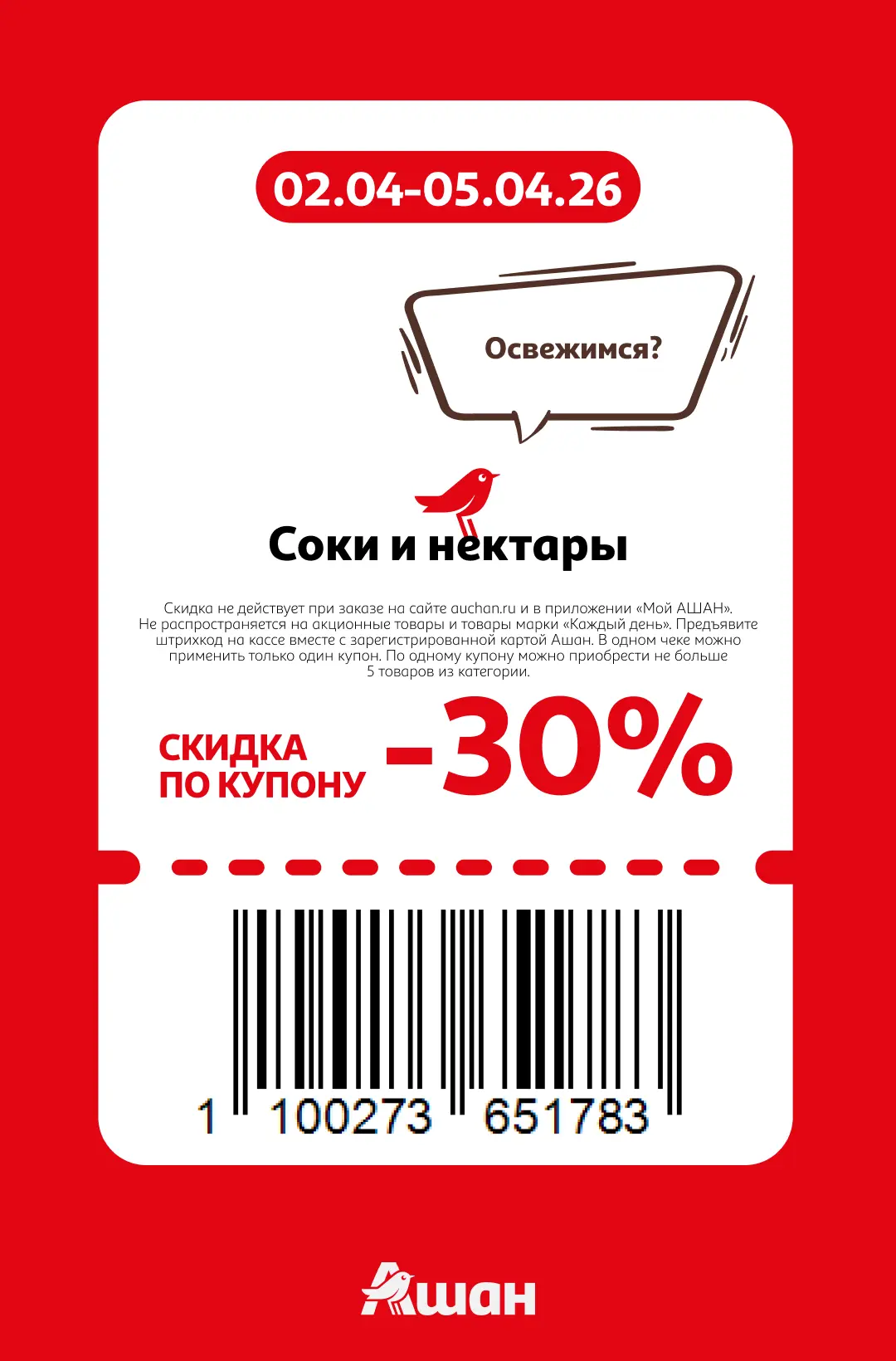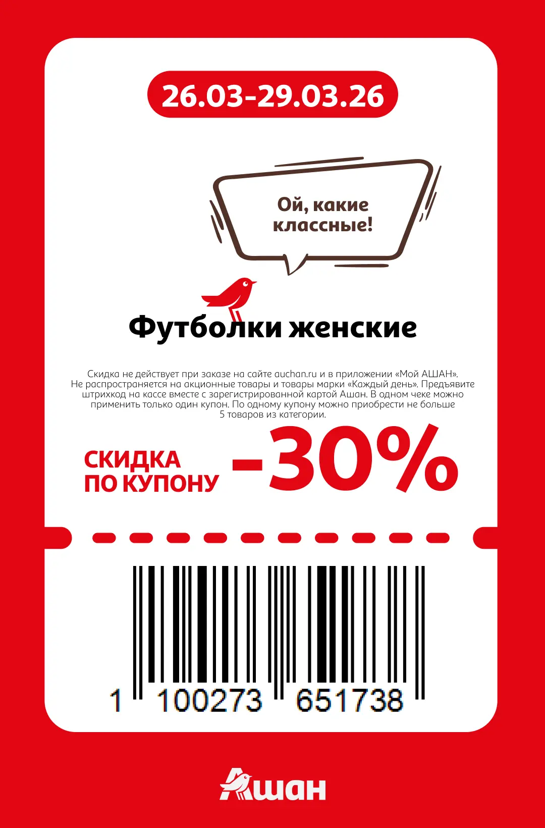 *Купоны можно применить только при предъявлении зарегистрированной карты Ашан. В одном чеке можно применить один купон. Не действуют на заказы на сайте и в мобильном приложении. По купону можно приобрести ограниченное количество товаров.