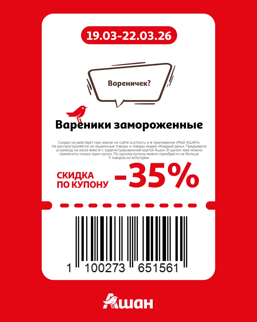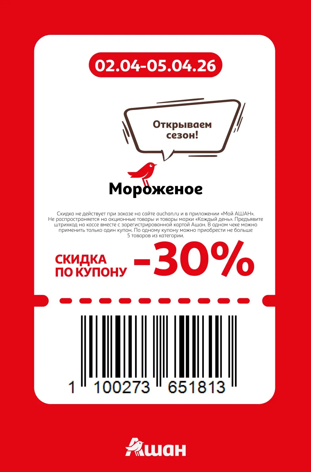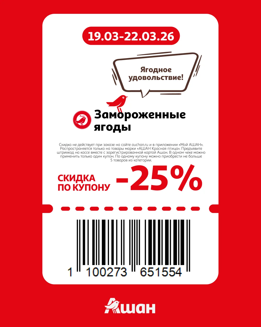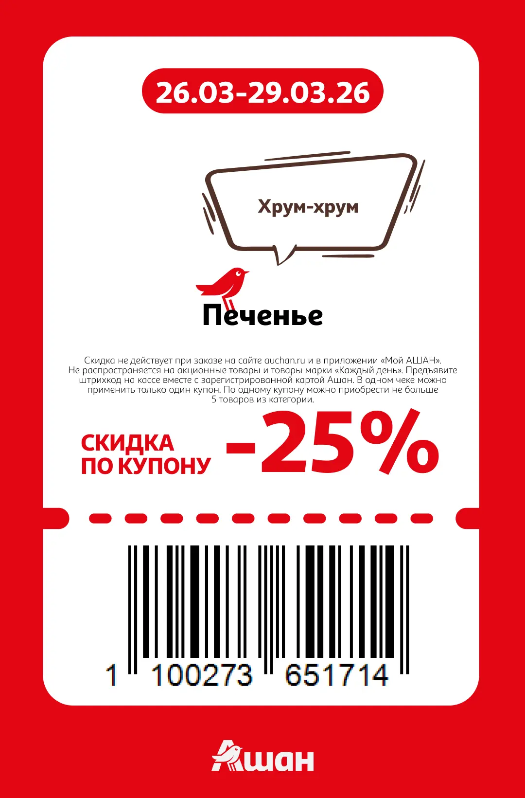 *Купоны можно применить только при предъявлении зарегистрированной карты Ашан. В одном чеке можно применить один купон. Не действуют на заказы на сайте и в мобильном приложении. По купону можно приобрести ограниченное количество товаров.