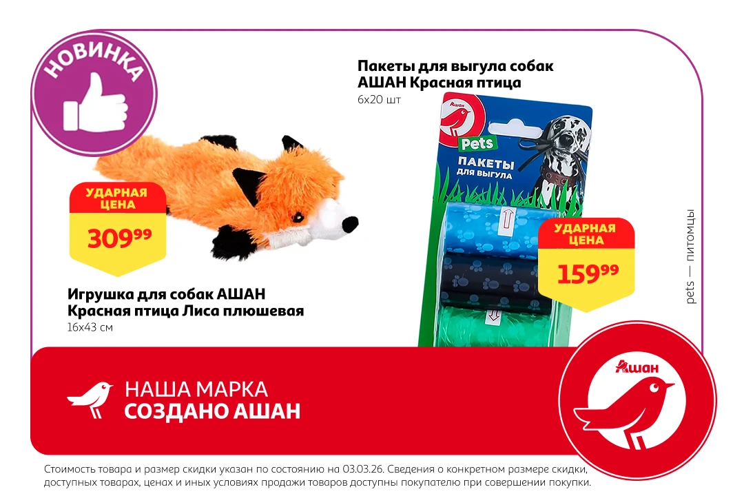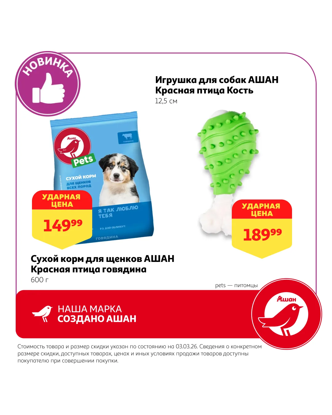 Собрали новинки для собак от марок Ашан Красная птица и Ашан Золотая птица. И вкусняшки, и игрушки, и даже полезные товары для гигиены.