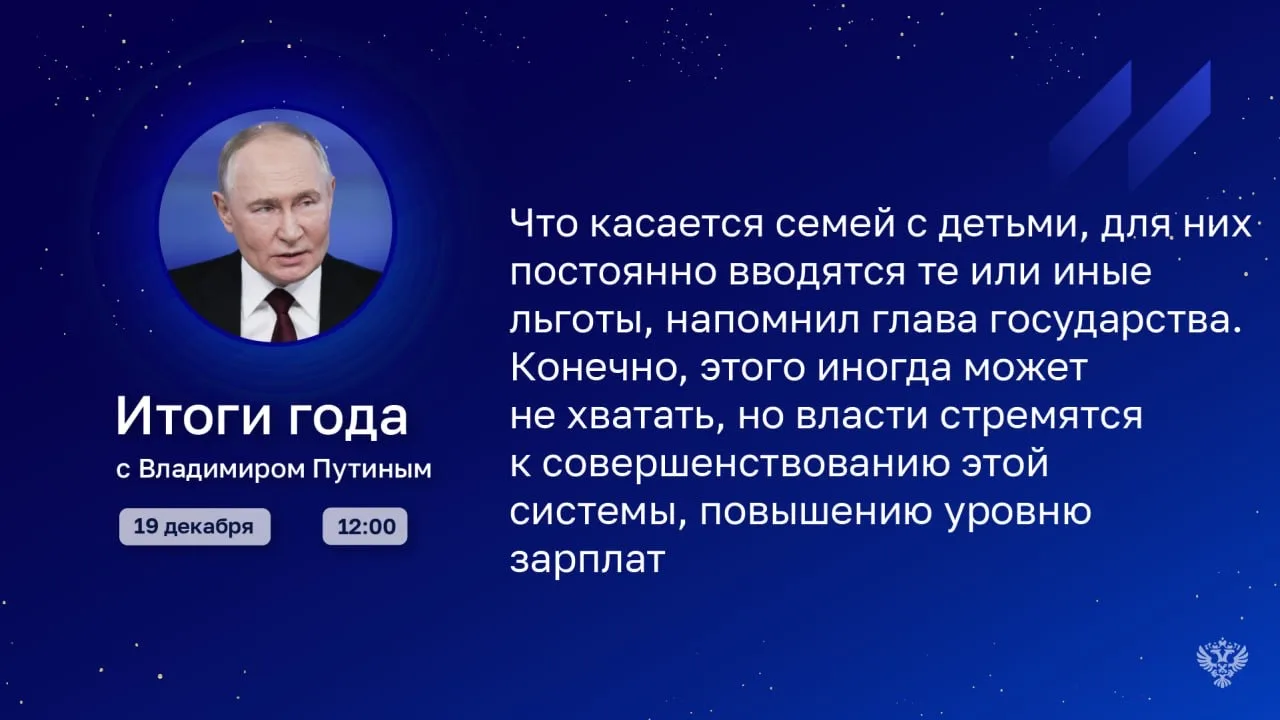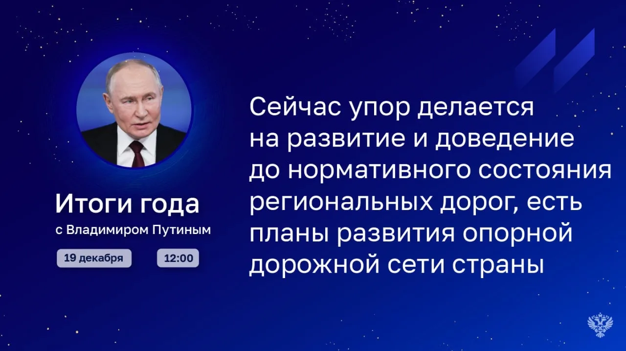 19 декабря в 12:00 в эфир выйдет программа «Итоги года с Владимиром Путиным». Президент ответит на вопросы граждан и журналистов.