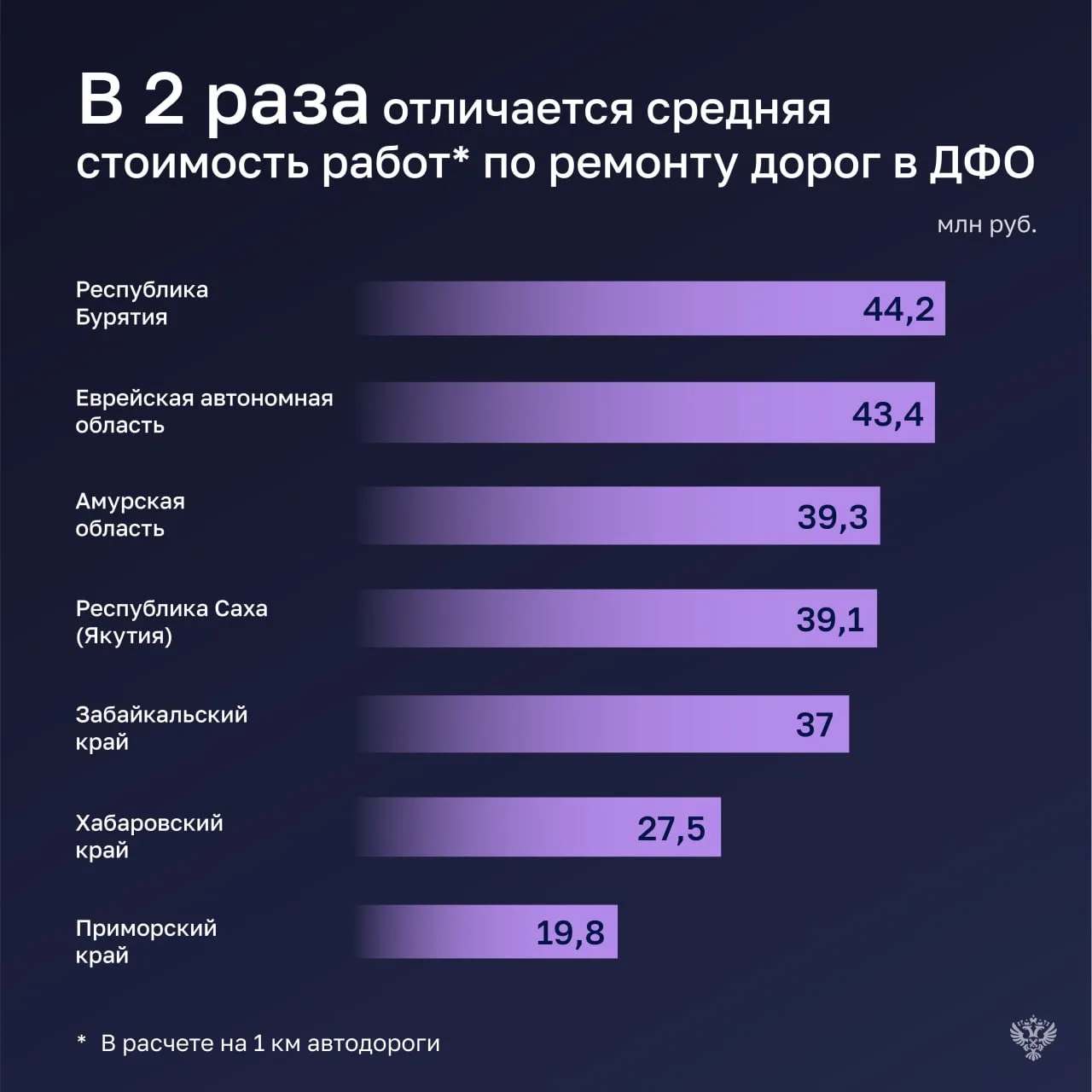 ➡️ В ДФО между регионами в 2 раза отличается показатель средней стоимости ремонтных работ. Например, на участках автодорог в Приморском крае он составляет 19,8 млн рублей за 1 км, а в Республике Бурятия — 44,2 млн рублей.