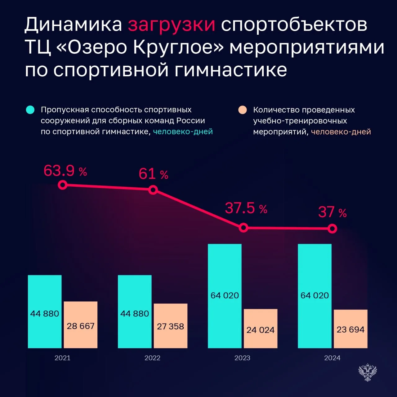 При этом, из-за снижения в 2021-2024 годах количества учебно-тренировочных мероприятий, загруженность спортивных объектов сократилась более чем на 27%.