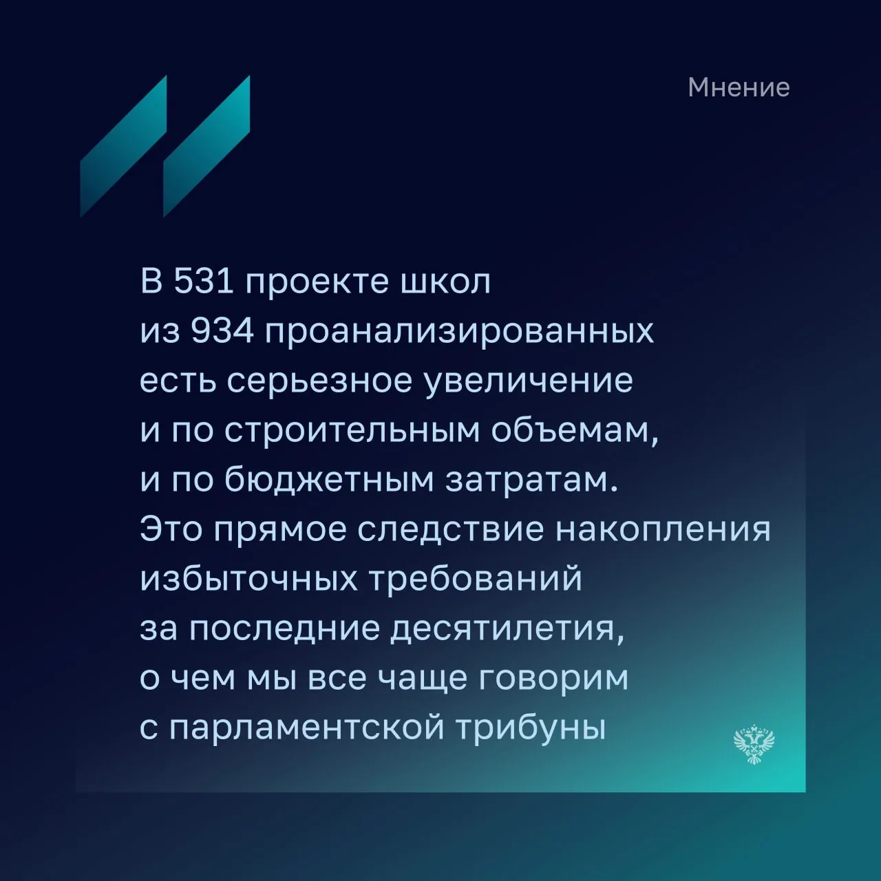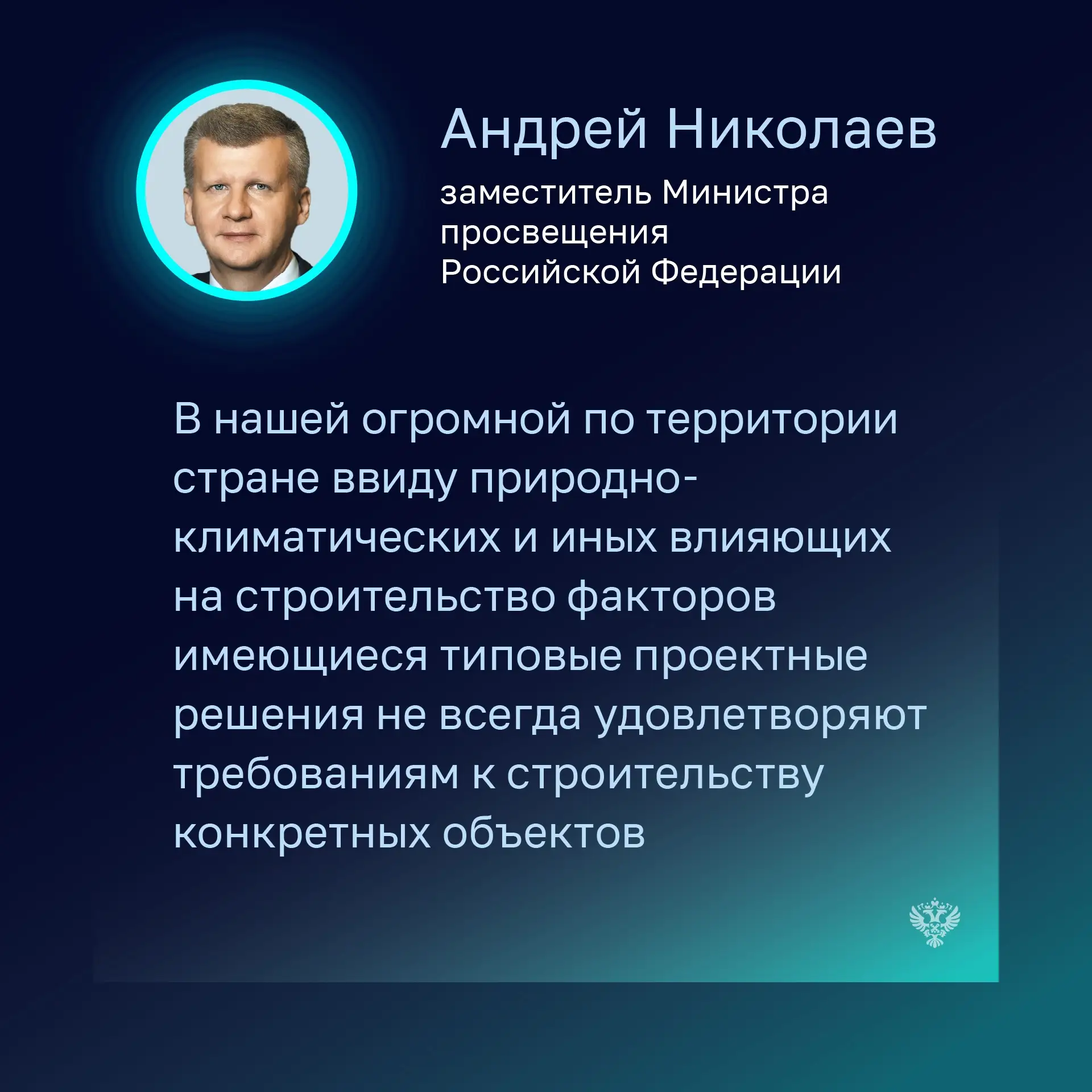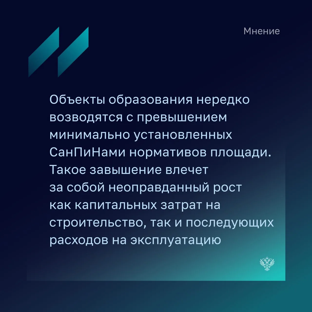 💬 Замминистр просвещения Андрей Николаев отметил, что стоимость строительства объектов отличается в разных регионах страны в зависимости от применяемых проектных решений, природно-климатических, гидрогеологических, логистических условий, стоимости строительных ресурсов в конкретном регионе, а также индивидуальных усложняющих факторов строительной площадки.