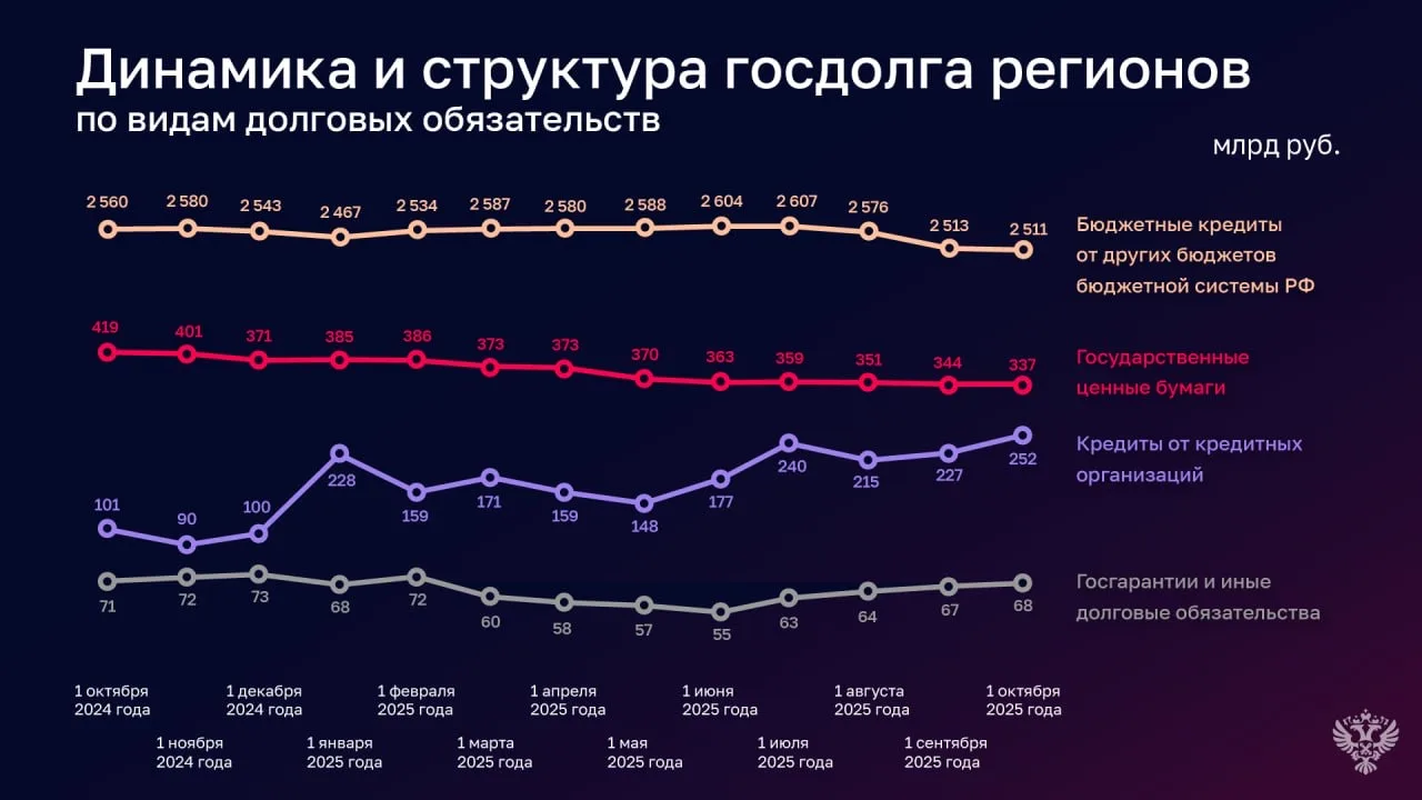 🔘 Госдолг регионов вырос на 3,4 млрд рублей и на 1 октября 2025 года составил 3,5 трлн рублей